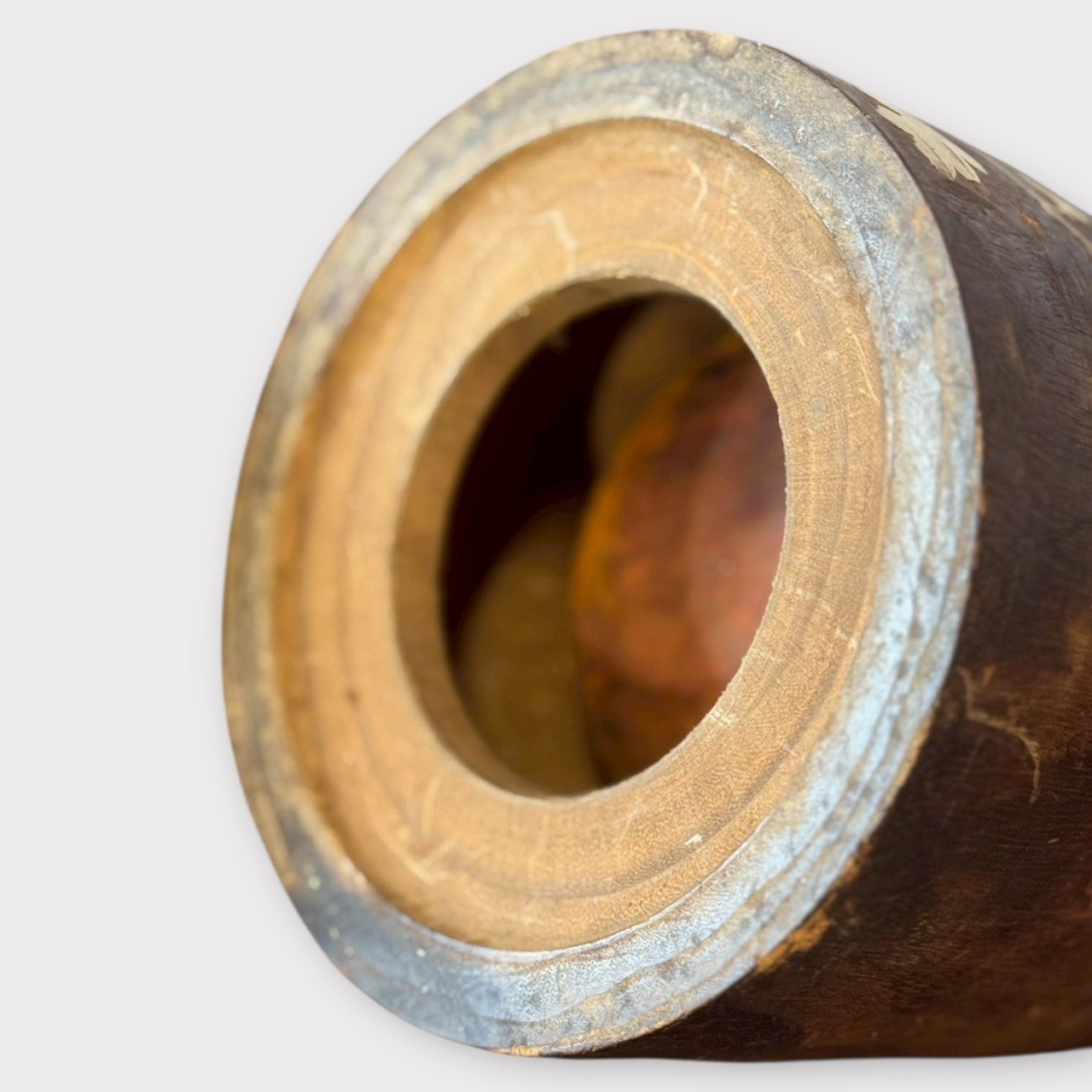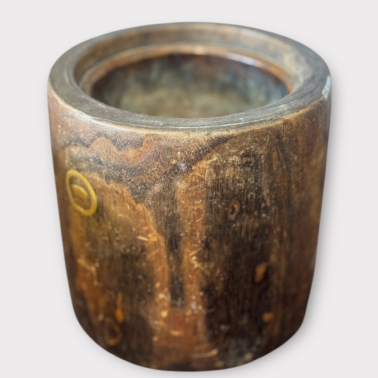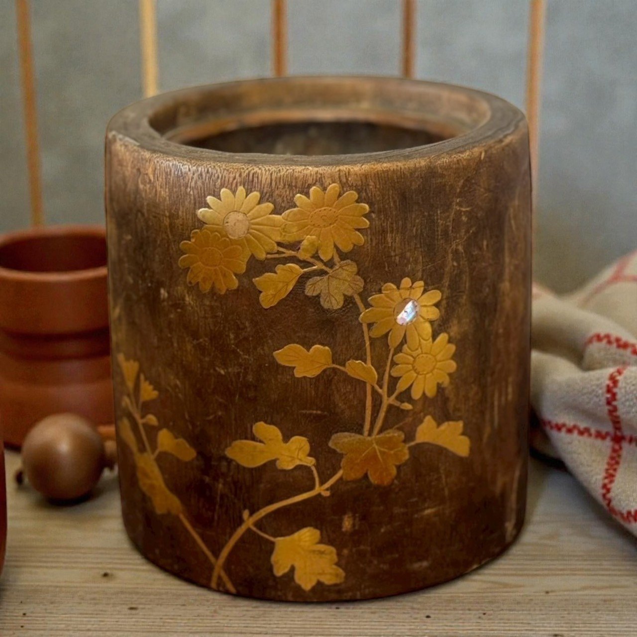 這是一只帶有濃厚和風氣息的桐木小火鉢,尺寸不大,卻十分耐看。整體以日本桐木製成,木紋柔和、重量輕盈,拿在手上沒有負擔,卻仍能感受到實木特有的溫度。經過時間洗禮,表面呈現略帶暗光的棕色調,邊緣與轉角有輕微磨損感,散發出老件才有的沉穩氣氛。外壁以金彩描繪菊花紋樣,花瓣層層綻放,枝葉交錯延伸,線條細膩而帶些手繪的不完美,正好呼應了「器用但不做作」的日式美學。金色菊花在深棕木底上格外突出,從遠處看是一圈低調的花影,近看則能欣賞到每片花瓣的細節。