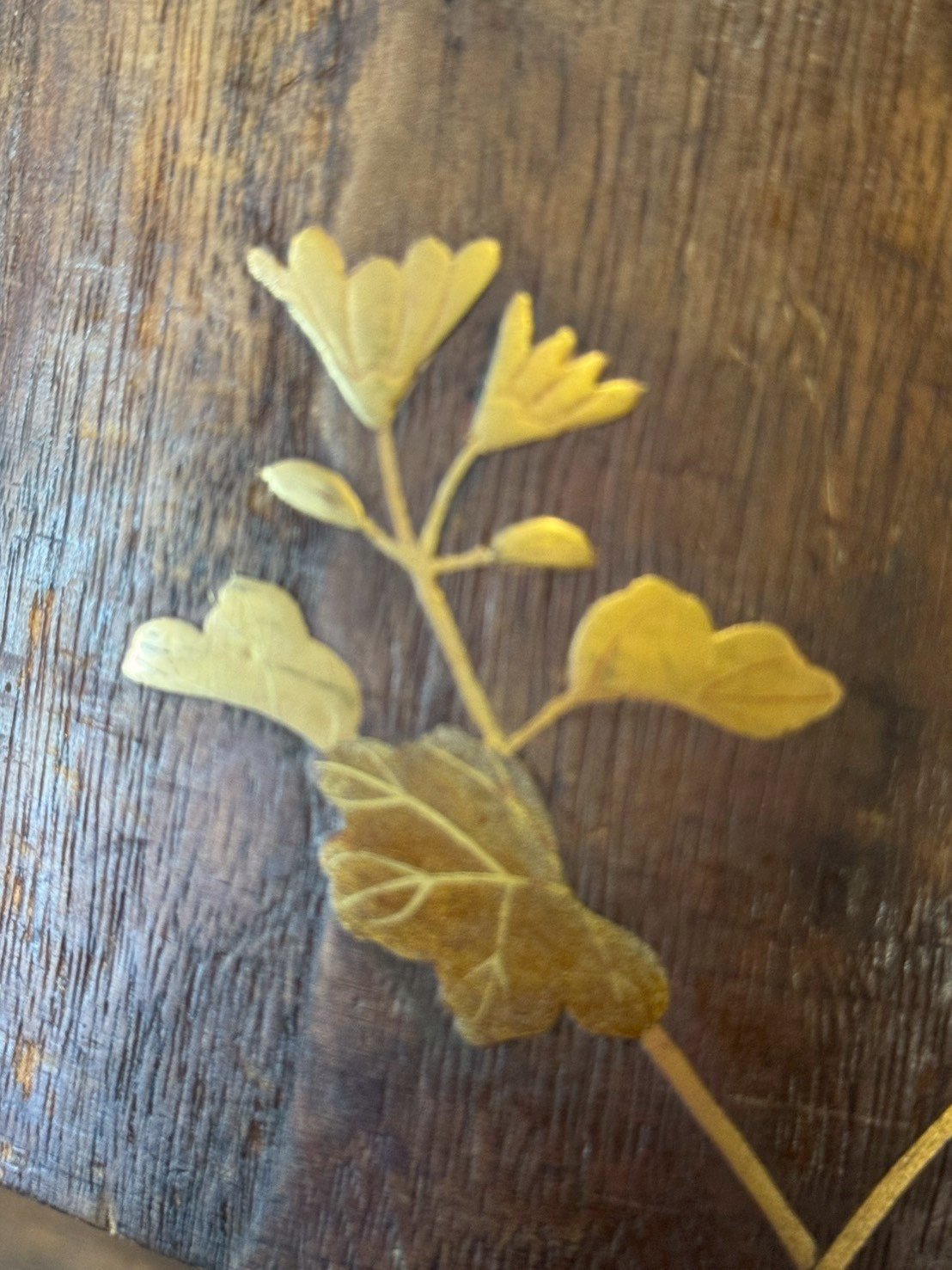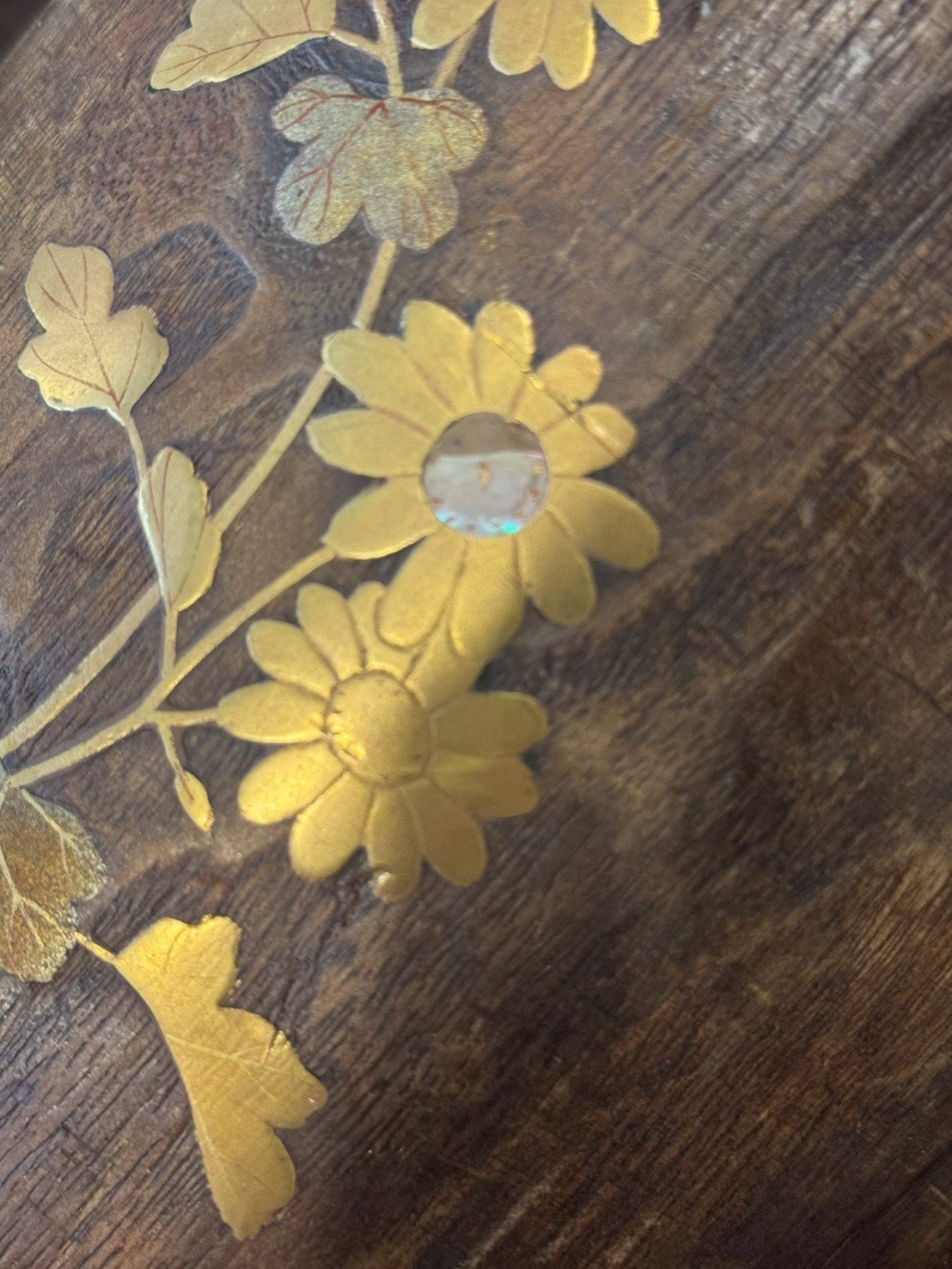 菊花在日本象徵高雅、延年與祝福,是相當具有代表性的吉祥圖案。金彩菊花隨著木身弧度繞行一圈,既有裝飾性,也為器物增添祝福寓意。
