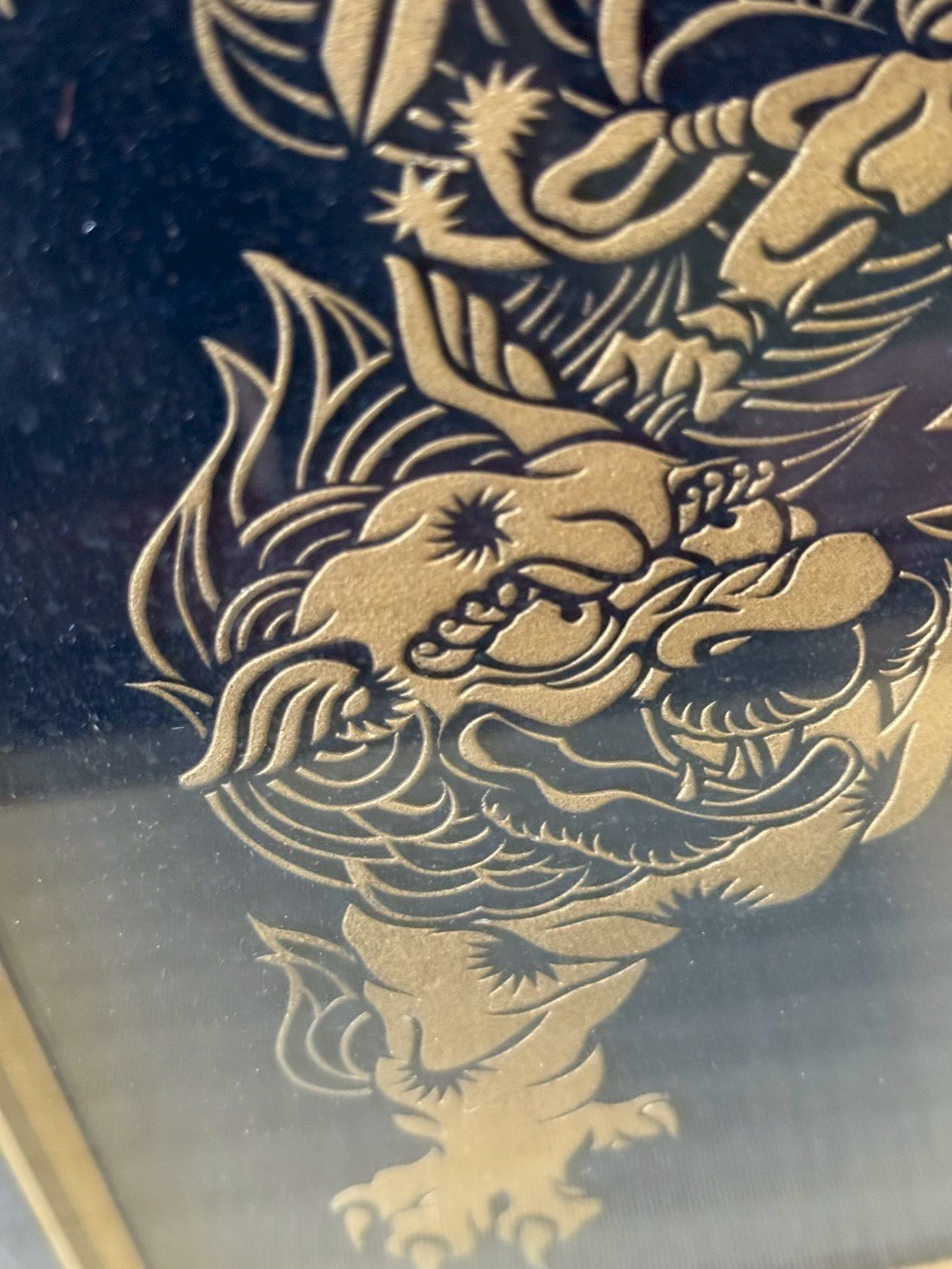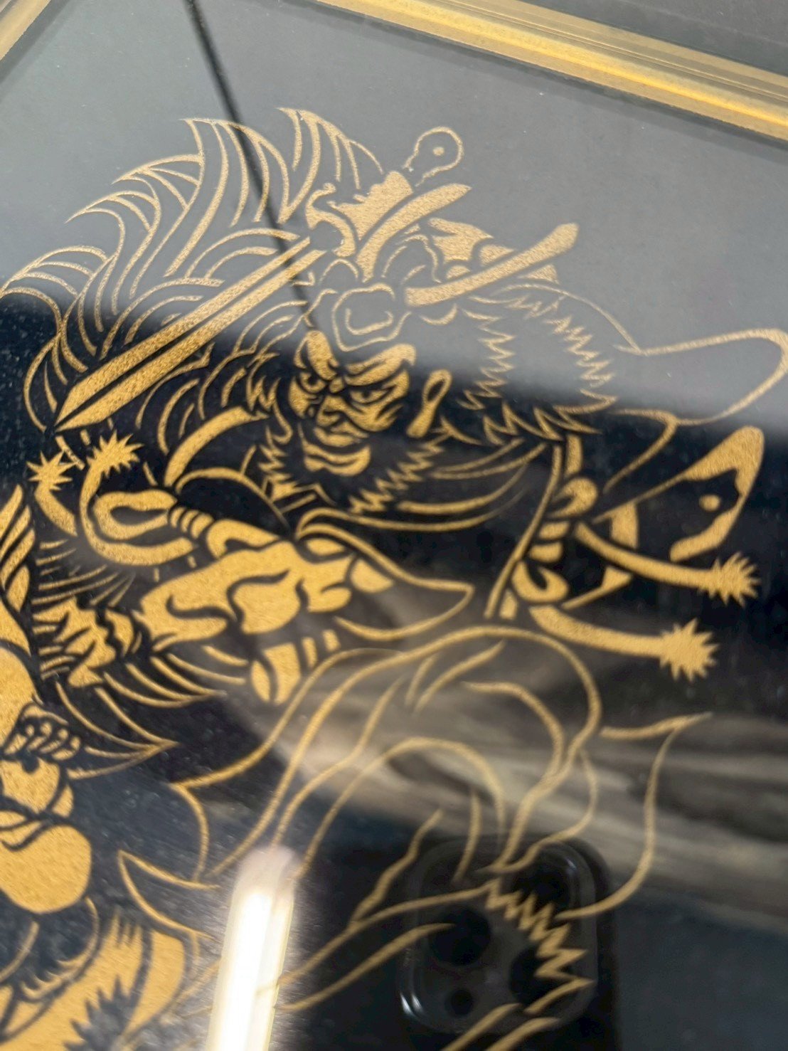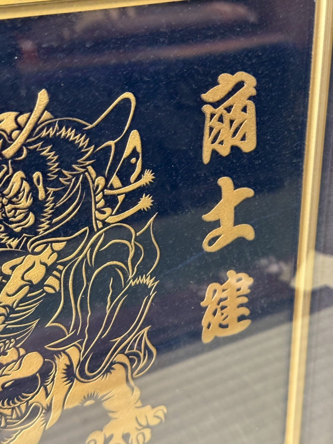 象徵守護與開運的圖騰: 畫面中的神獸姿態威猛,在日本傳統文化中具有「鎮宅辟邪」、「守財納福」的積極象徵。這類作品常被安置於空間入口或重要位置,作為祈求平安與事業穩固的「鎮守」之物。