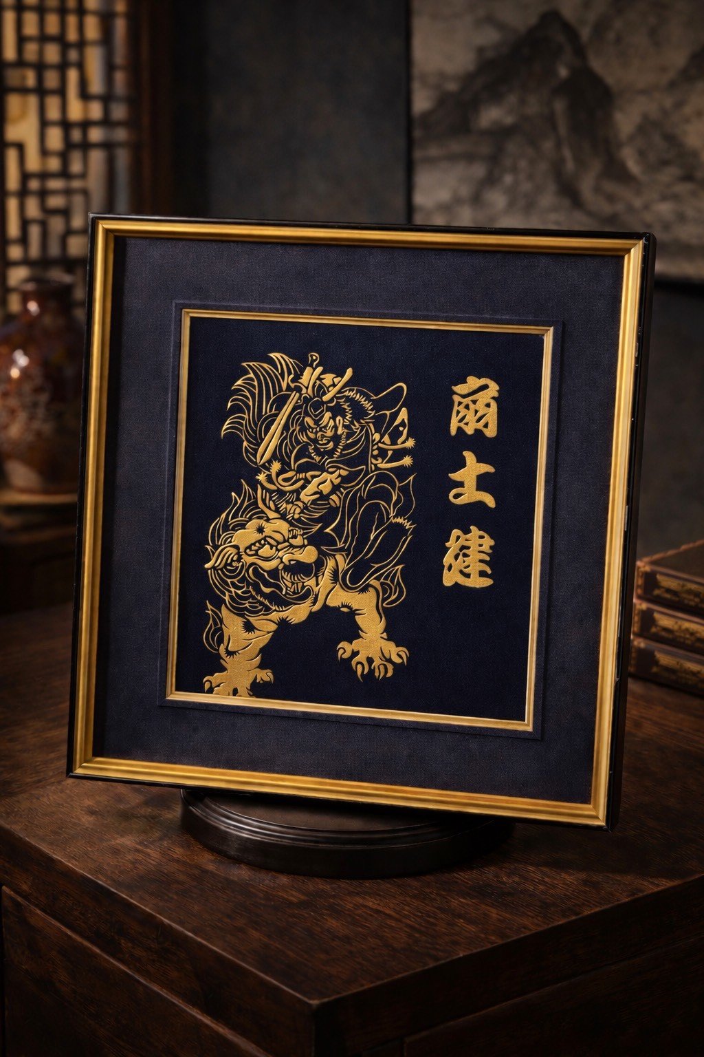 金紋雕刻的視覺張力: 作品核心以細膩的金線雕刻呈現,神獸毛髮張揚、眼神銳利,與人物的力道相互呼應。在深色織紋襯底的烘托下,金色的線條更顯明亮且具備立體感,展現出「金彩」特有的高貴氣息。