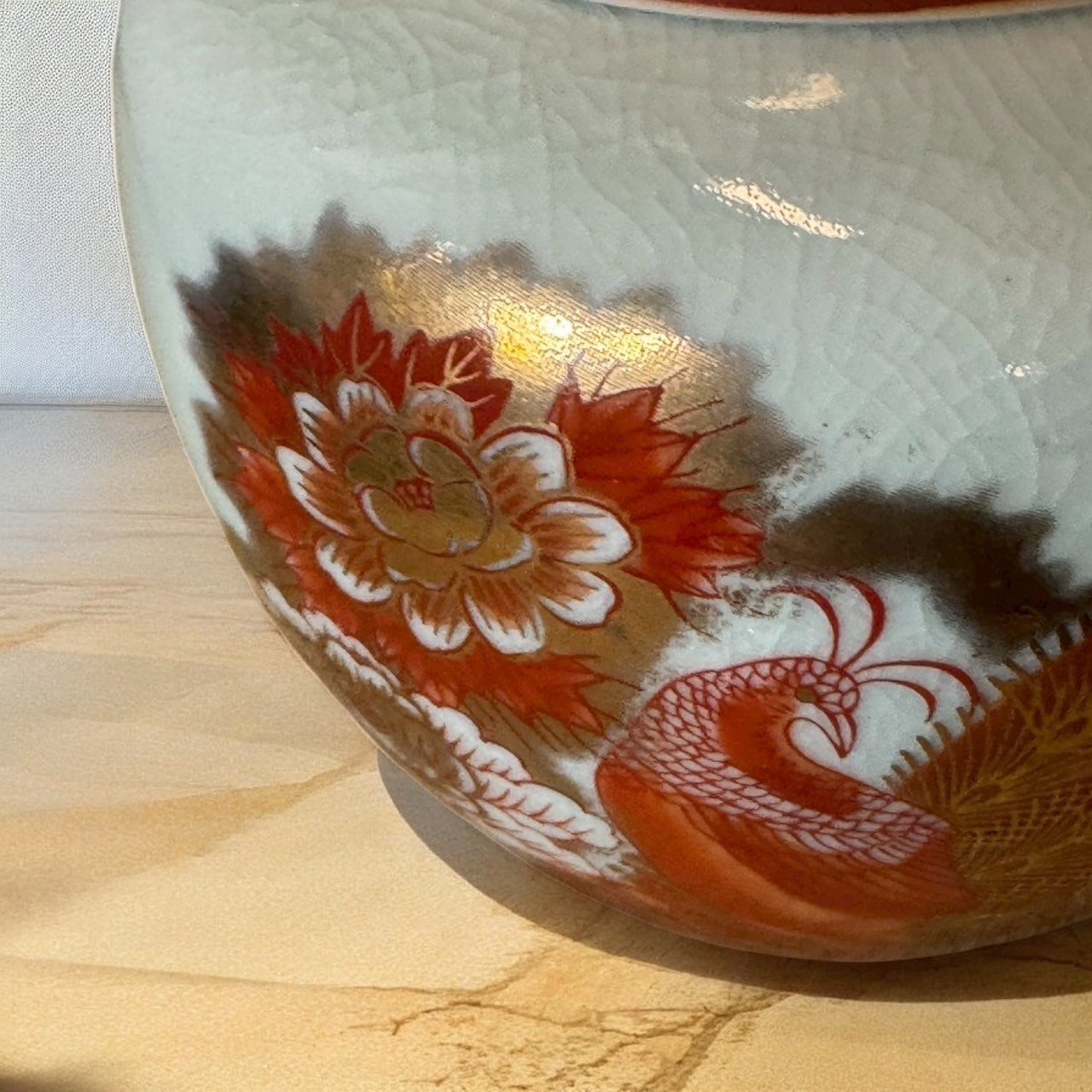 典型九谷錦手工藝:此蓋罐展現九谷燒最具代表性的「錦手(金襴手)」風格,以赤繪為主調,再加上金彩層層描繪,鳳凰羽毛與牡丹花瓣皆以細緻筆觸描摹,金彩厚薄有致,能在光線下閃耀出華麗的光澤。