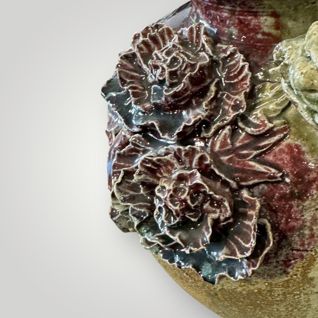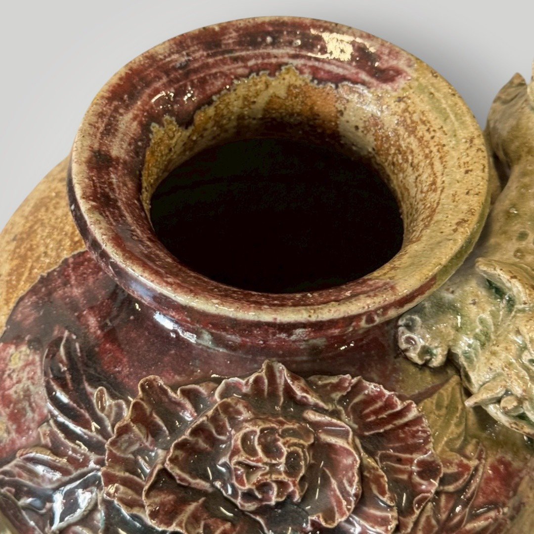 1. 融合「信樂燒」與「辰砂釉」的窯變藝術 瓶身基底呈現信樂燒典型的「緋色」與「長石顆粒」特徵,展現出陶土最原始的火色感。而在立體牡丹處,大膽施予了難度極高的辰砂釉(Copper Red Glaze),這種釉料在還原燒製過程中會呈現出如牛血紅般的深邃層次,與質樸的土質胎體形成極具張力的「野性與華麗」對比。