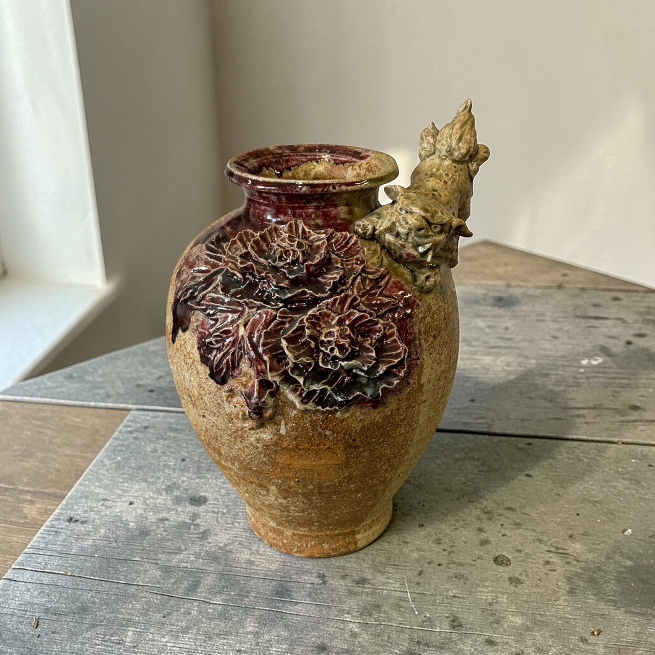 2. 難度極高的「立體捏塑」與「貼花」工藝 不同於一般彩繪或淺浮雕,這件作品的牡丹花與唐獅子是採用**手捏(Te-zukune)**後再「貼築」於瓶身上的。職人需在坯體半乾時,精確掌握花瓣的薄度與支撐力,層層疊加出牡丹的盛放美感。這種立體工藝極大增加了燒製時的變形與開裂風險,因此每一件成品都是萬中選一。