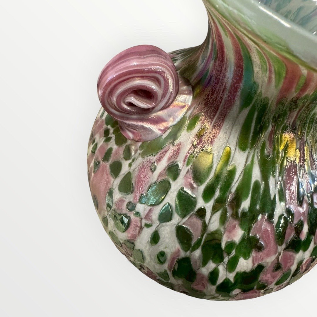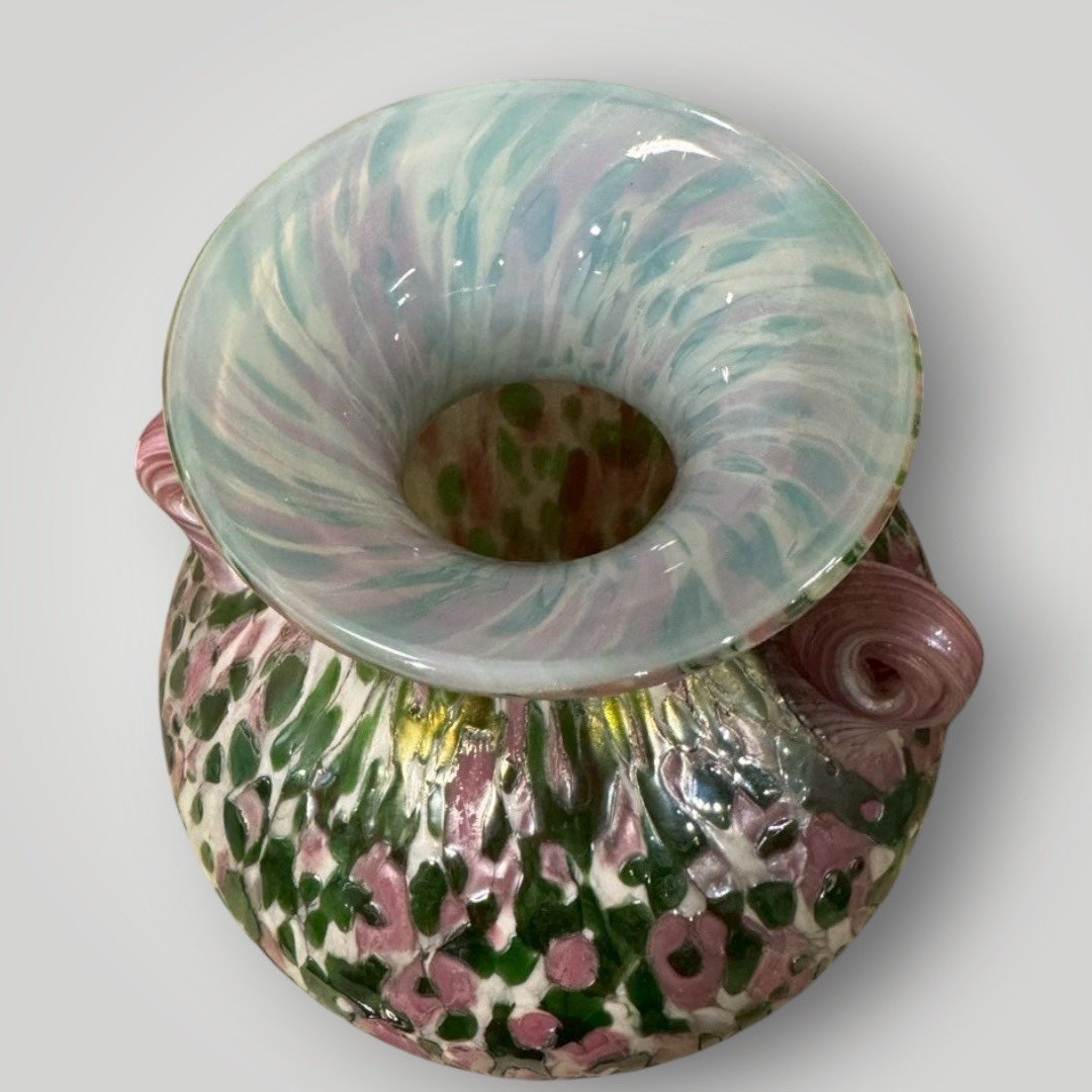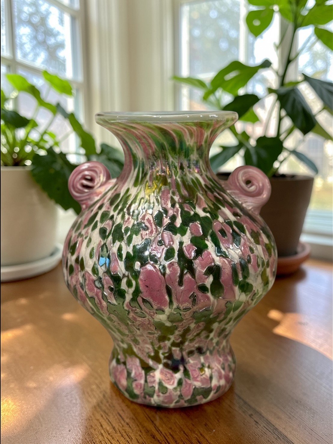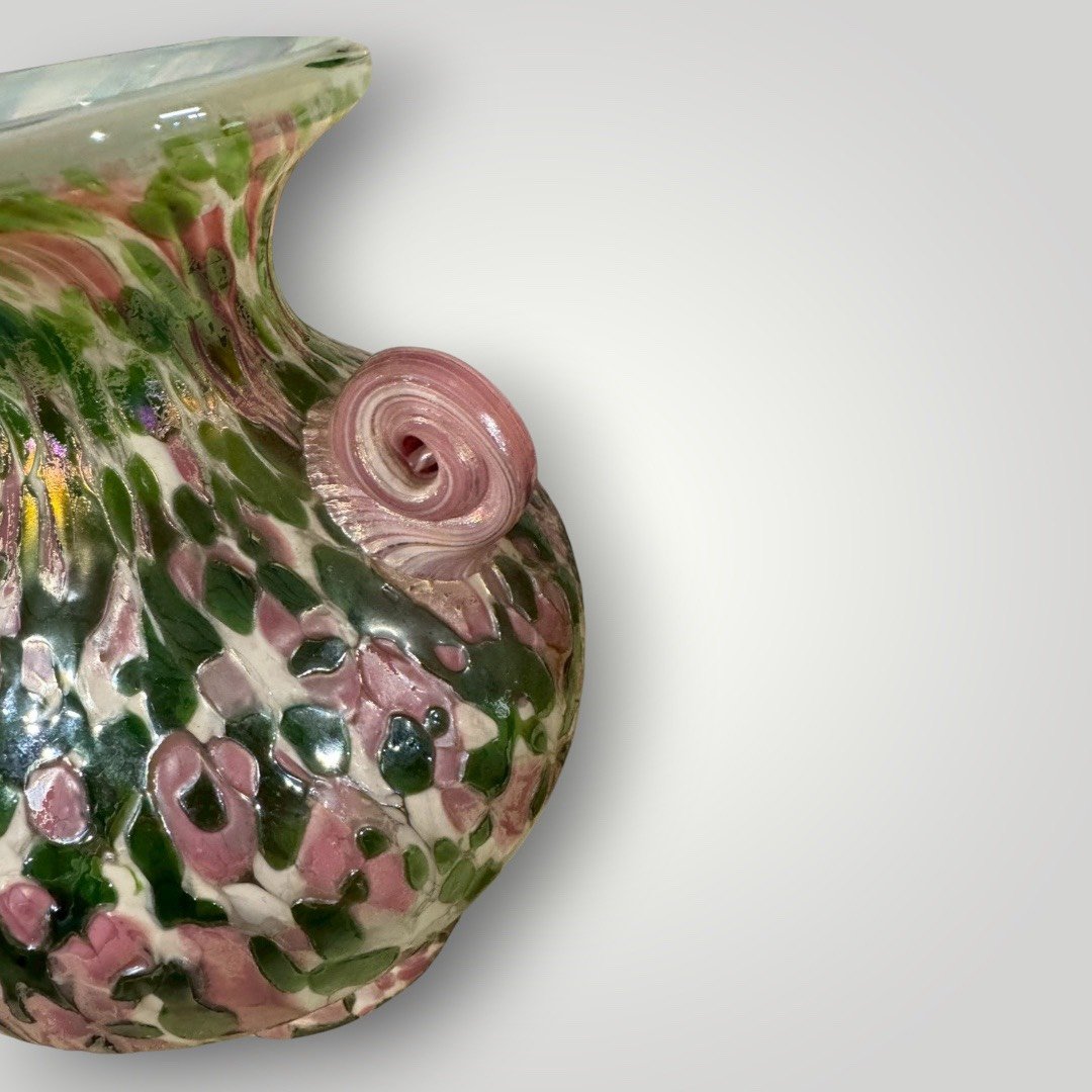 這款花器採用了極其複雜的多色玻璃嵌合技術。瓶身以柔和的櫻粉色為主基調,交織著鮮亮的翠綠與潔白點綴,營造出一種如同「春日花叢」或「莫內印象派油畫」般的視覺感。每一處色彩的分佈都是獨一無二的,展現出手工吹製玻璃不可複製的隨性美。