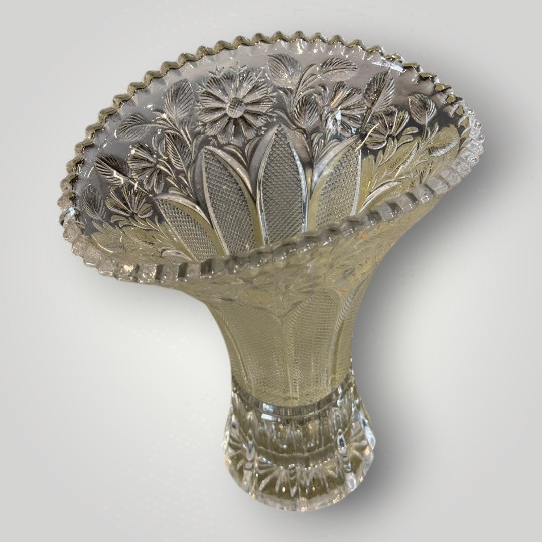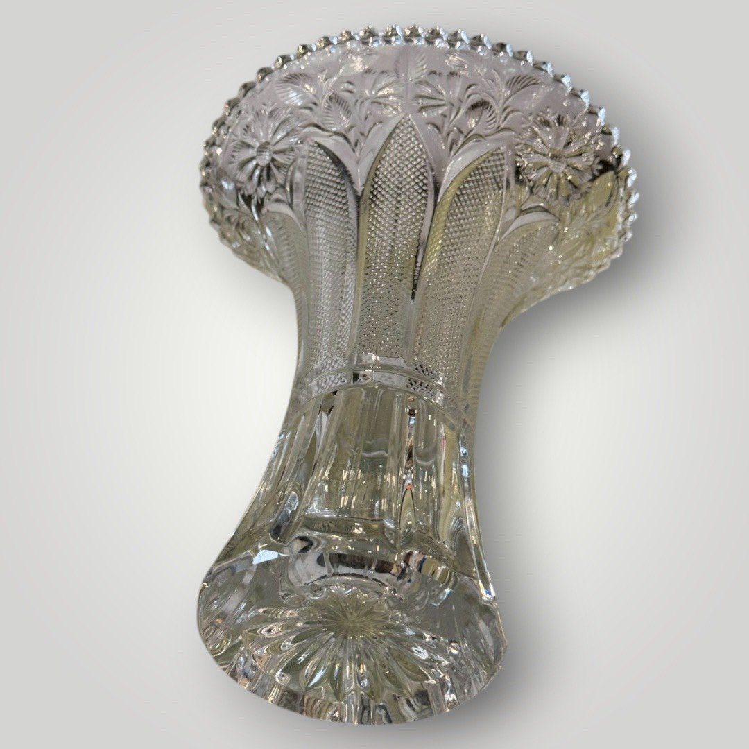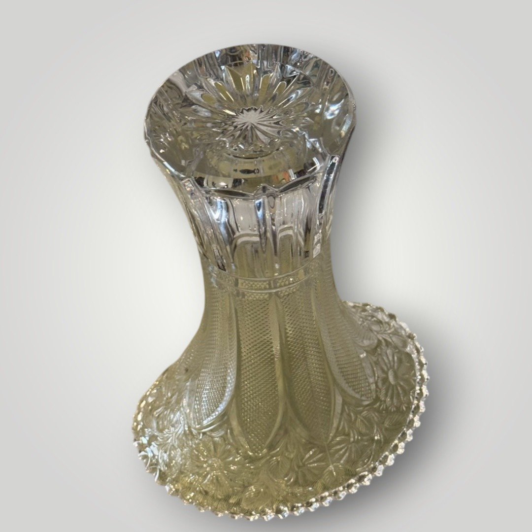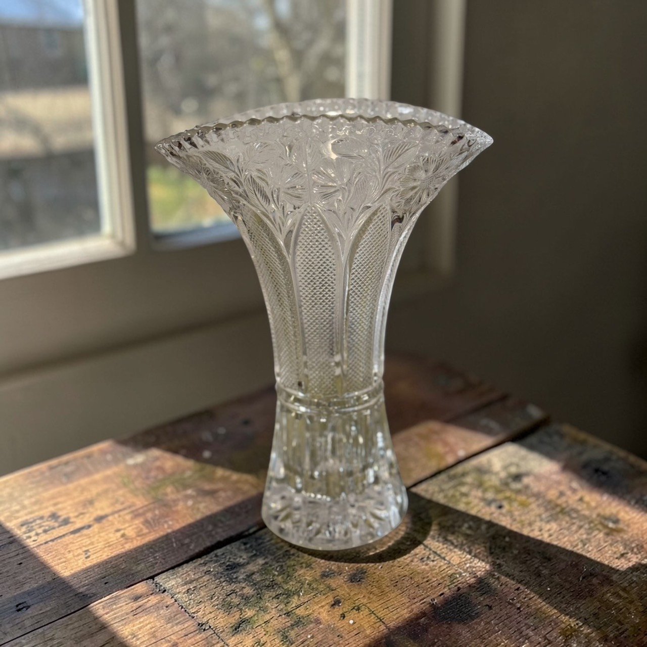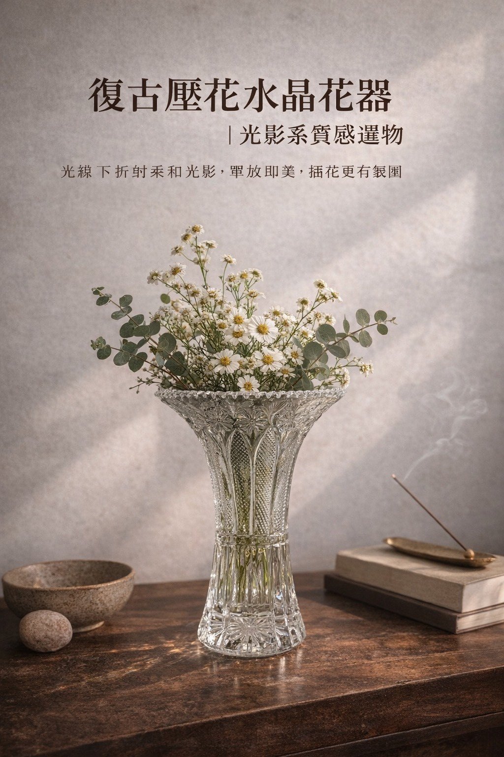 瓶身佈滿了繁複且精密的幾何壓花與植物紋飾。當光線穿透厚實的水晶玻璃時,會透過無數個切割面產生如鑽石般的璀璨折射,在桌面或牆面投射出波光粼粼的夢幻影子,即便不插花,也是一件極具存在感的靜物藝術。
