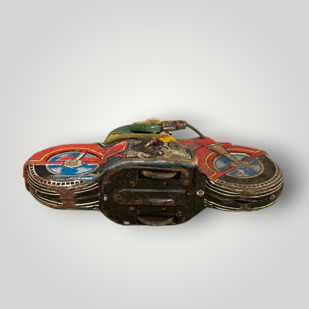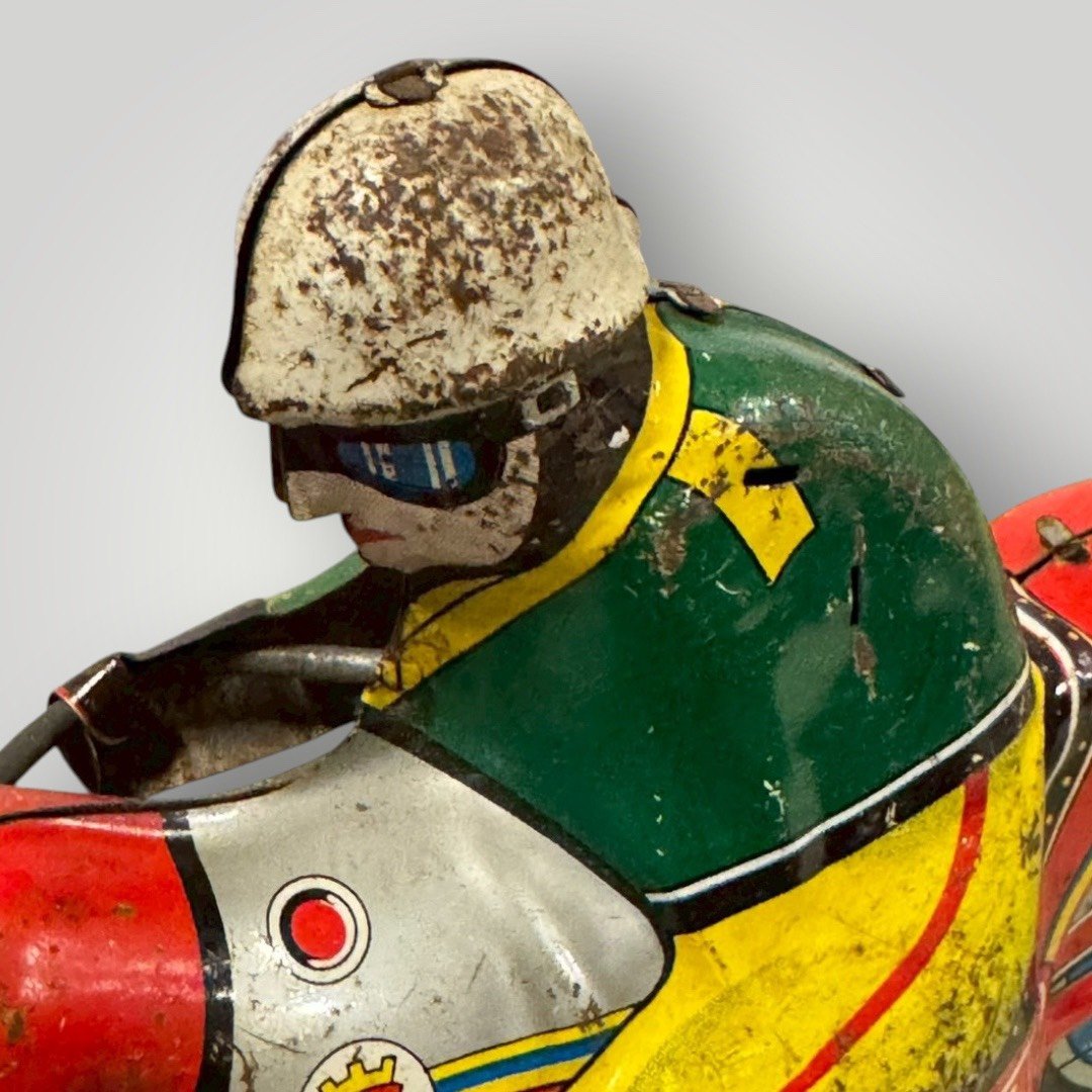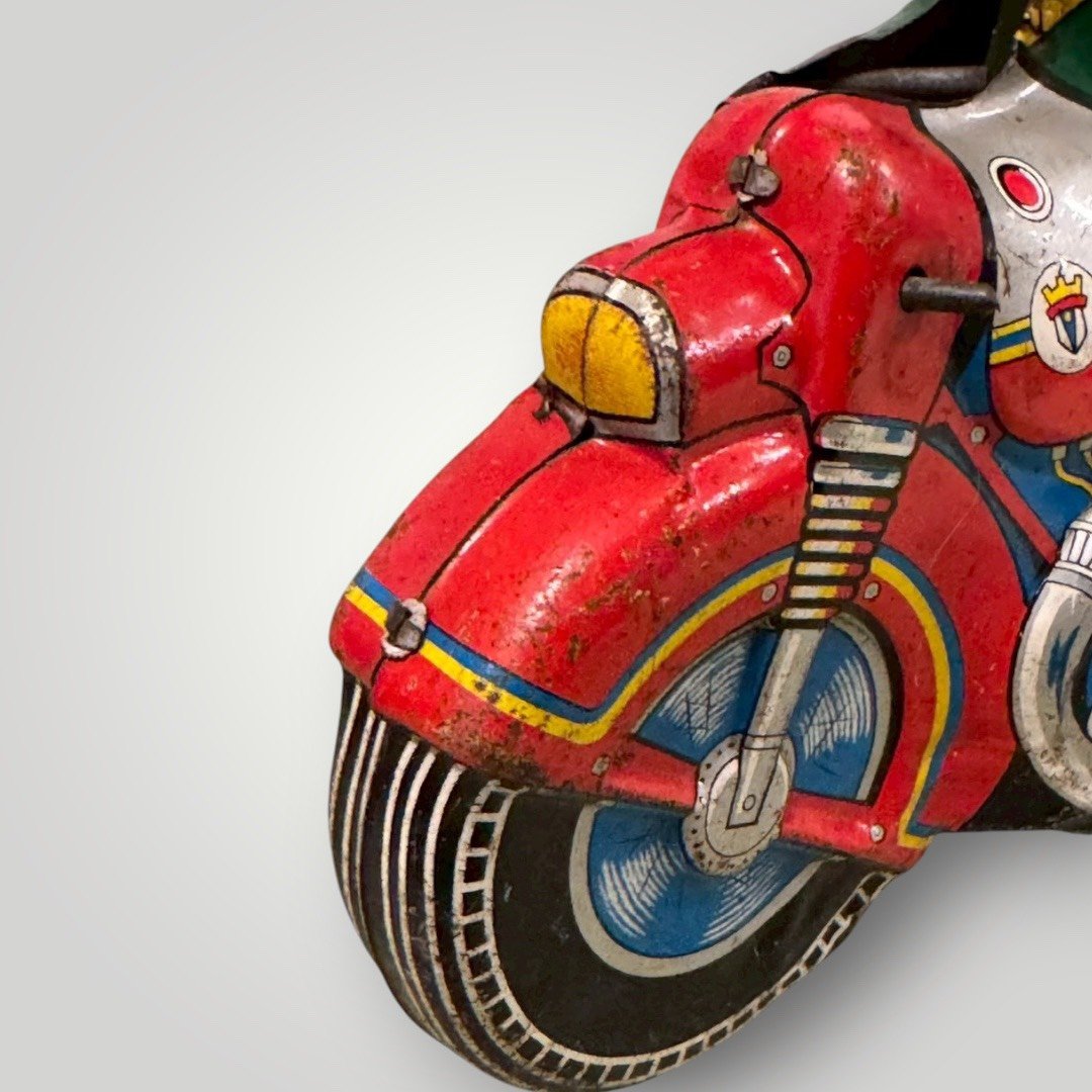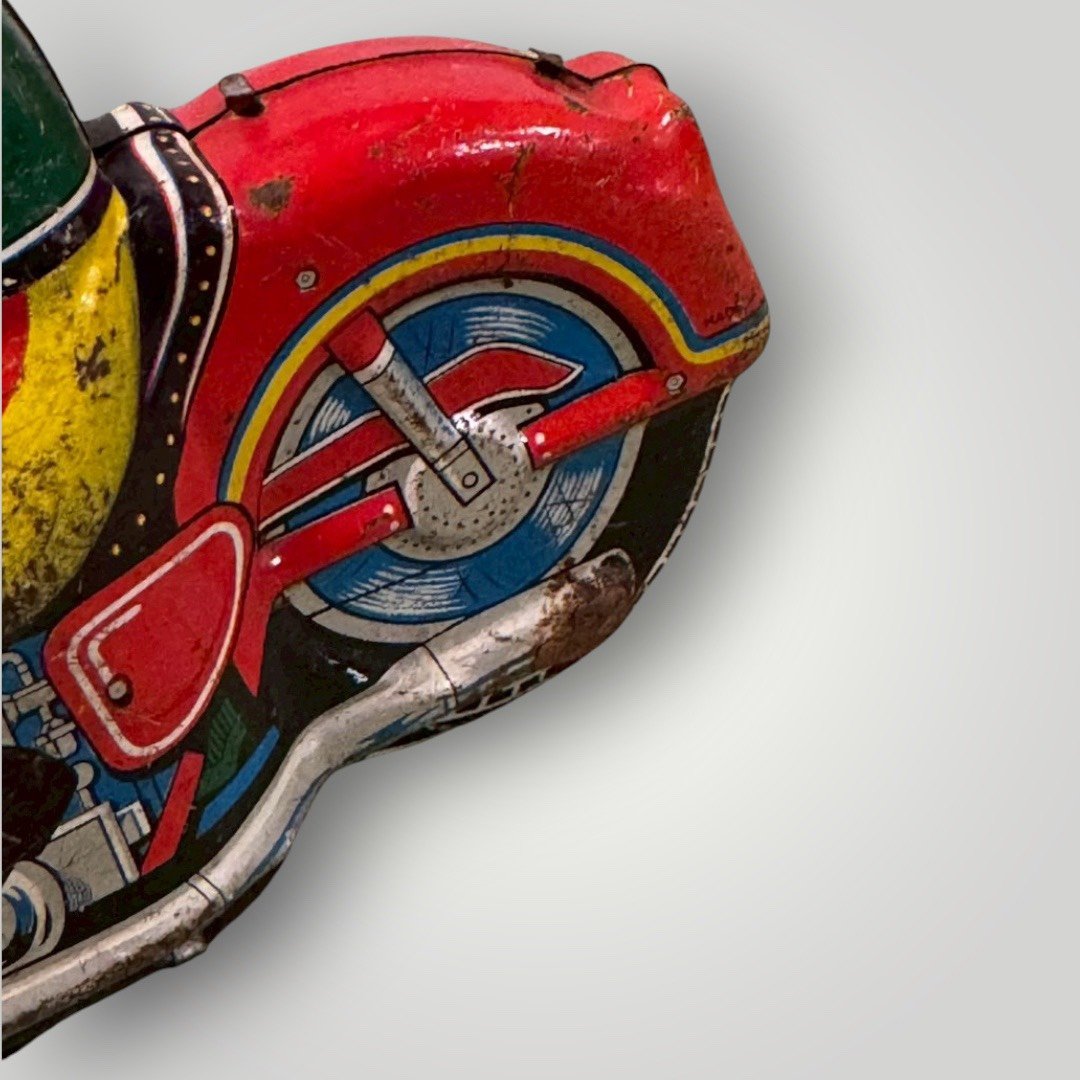 這件作品最迷人之處在於其色彩濃郁的錫版印刷。紅、黃、綠的撞色配置,帶有強烈的早期美式賽車風格。車身上的機械構造細節、油箱標誌、甚至是騎士的護目鏡與夾克紋理,皆以細緻的印刷呈現,這是當今塑料玩具完全無法取代的金屬美學。