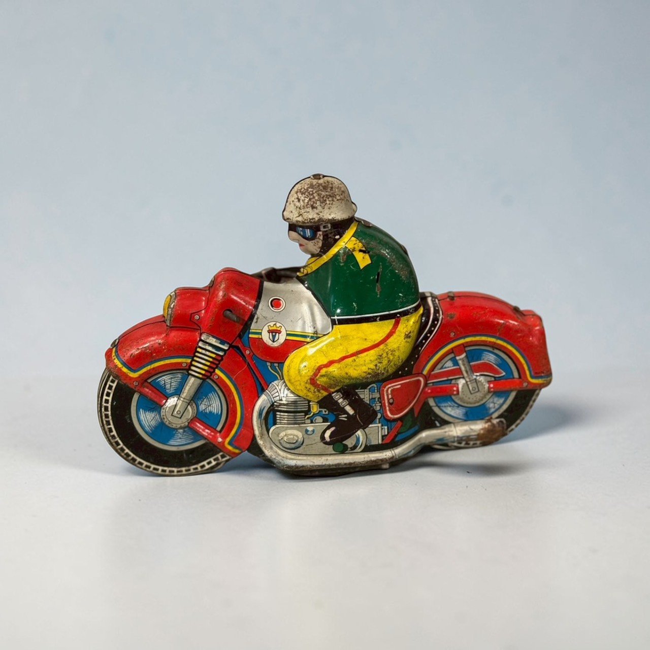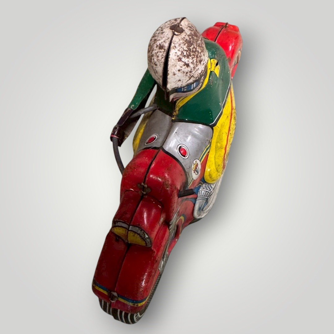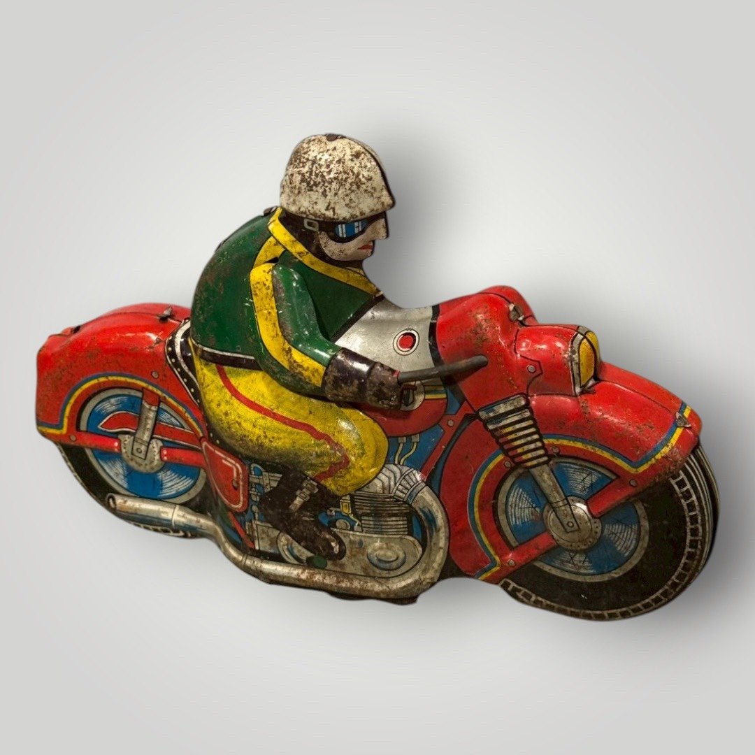 這件作品最迷人之處在於其色彩濃郁的錫版印刷。紅、黃、綠的撞色配置,帶有強烈的早期美式賽車風格。車身上的機械構造細節、油箱標誌、甚至是騎士的護目鏡與夾克紋理,皆以細緻的印刷呈現,這是當今塑料玩具完全無法取代的金屬美學。