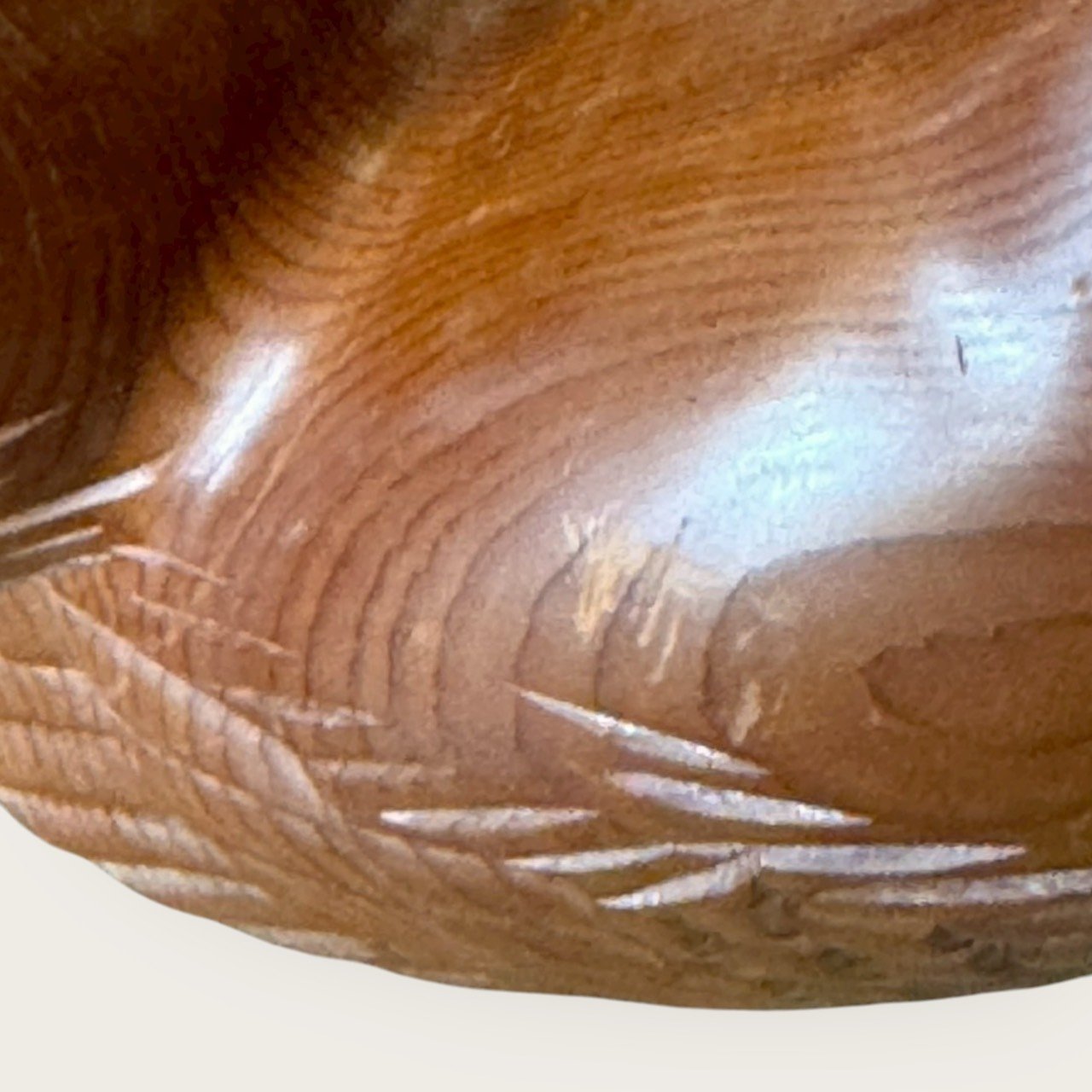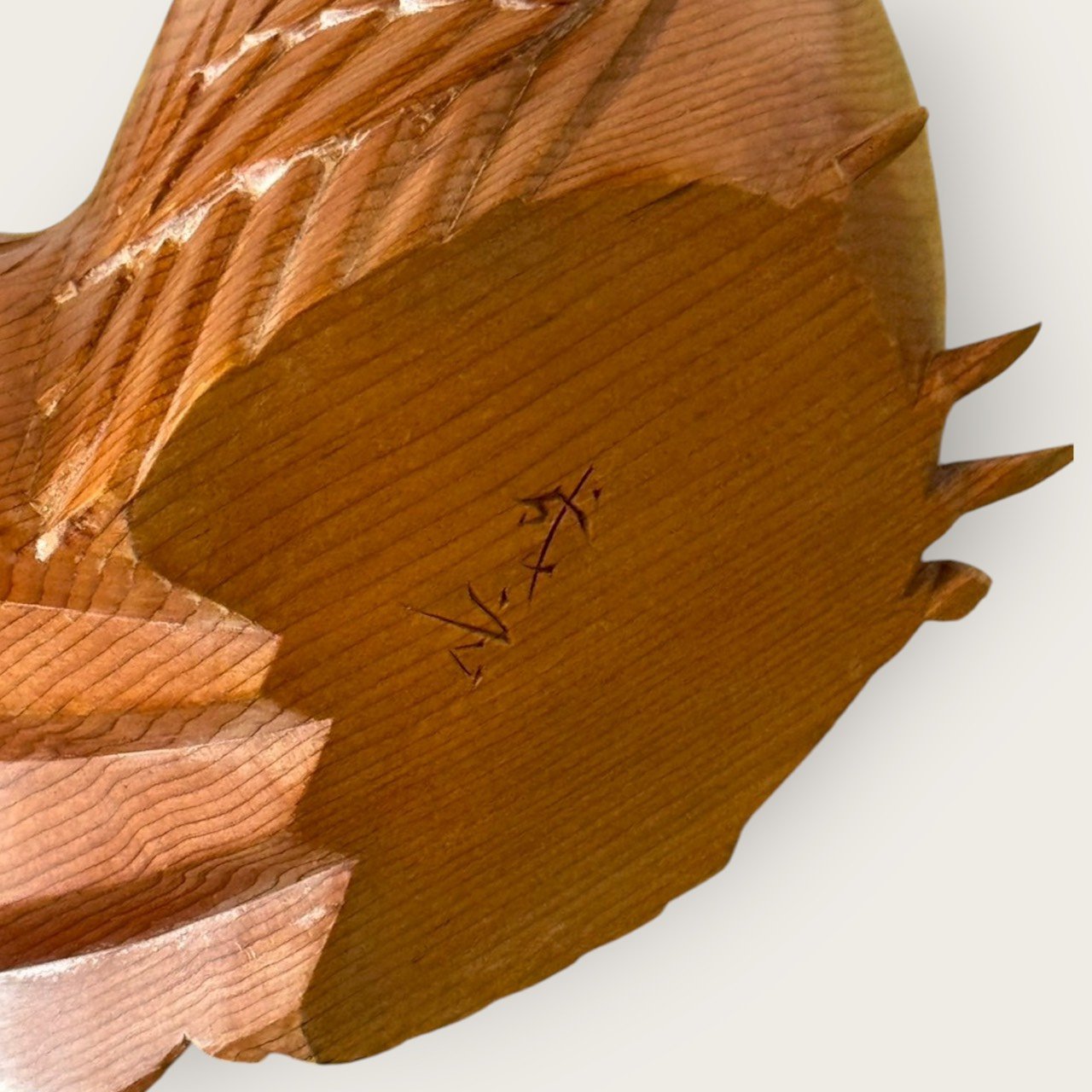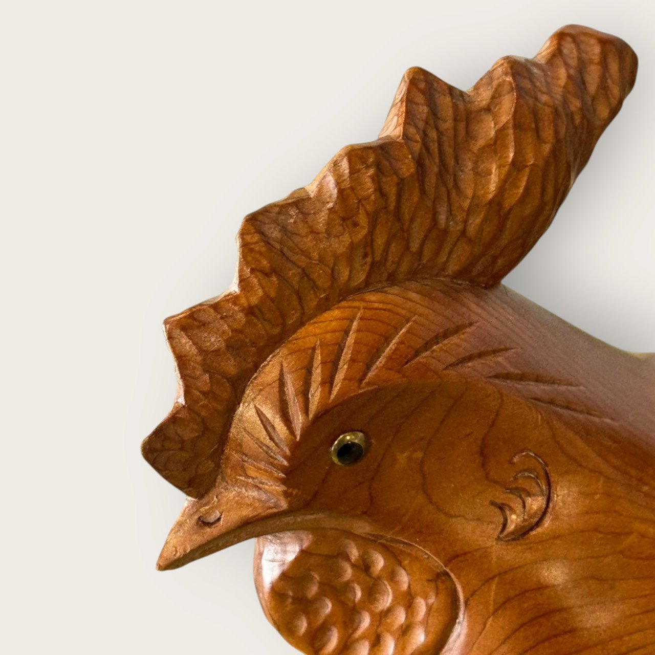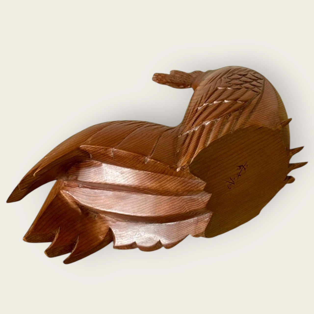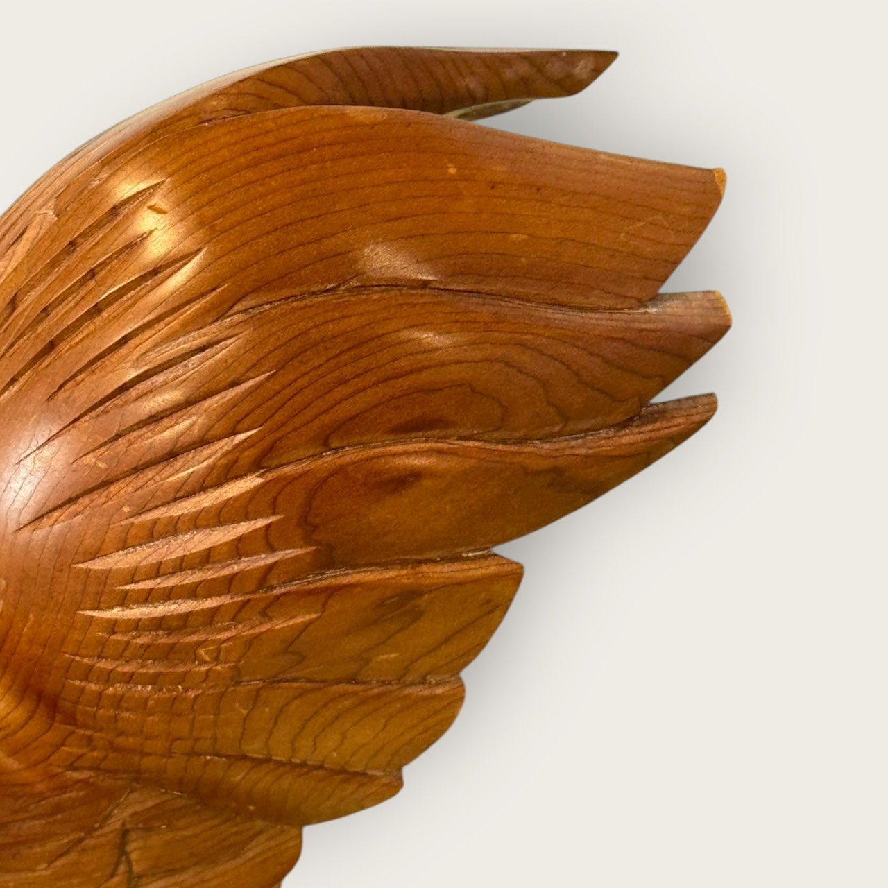 刀痕與羽刻:胸腹的順刨紋、翅尾的羽片分層清晰,手作刀味十足。