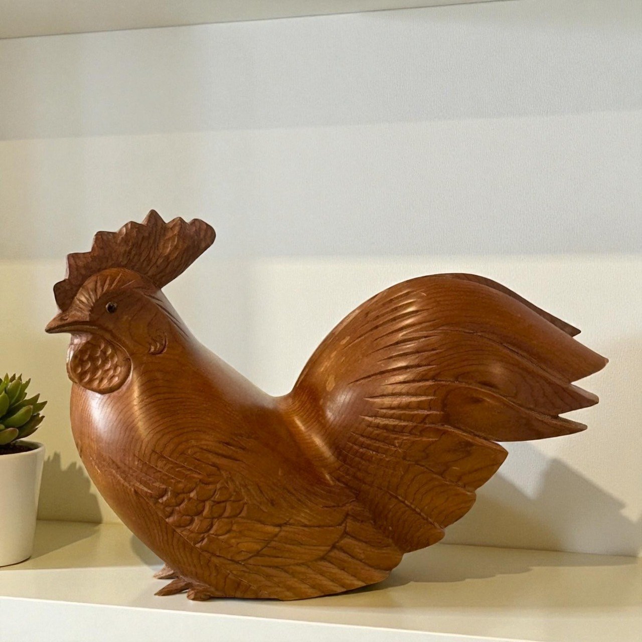 寫意動勢:胸前隆起、頭冠高立、尾羽外展,完整傳達公雞自信昂揚的氣勢。