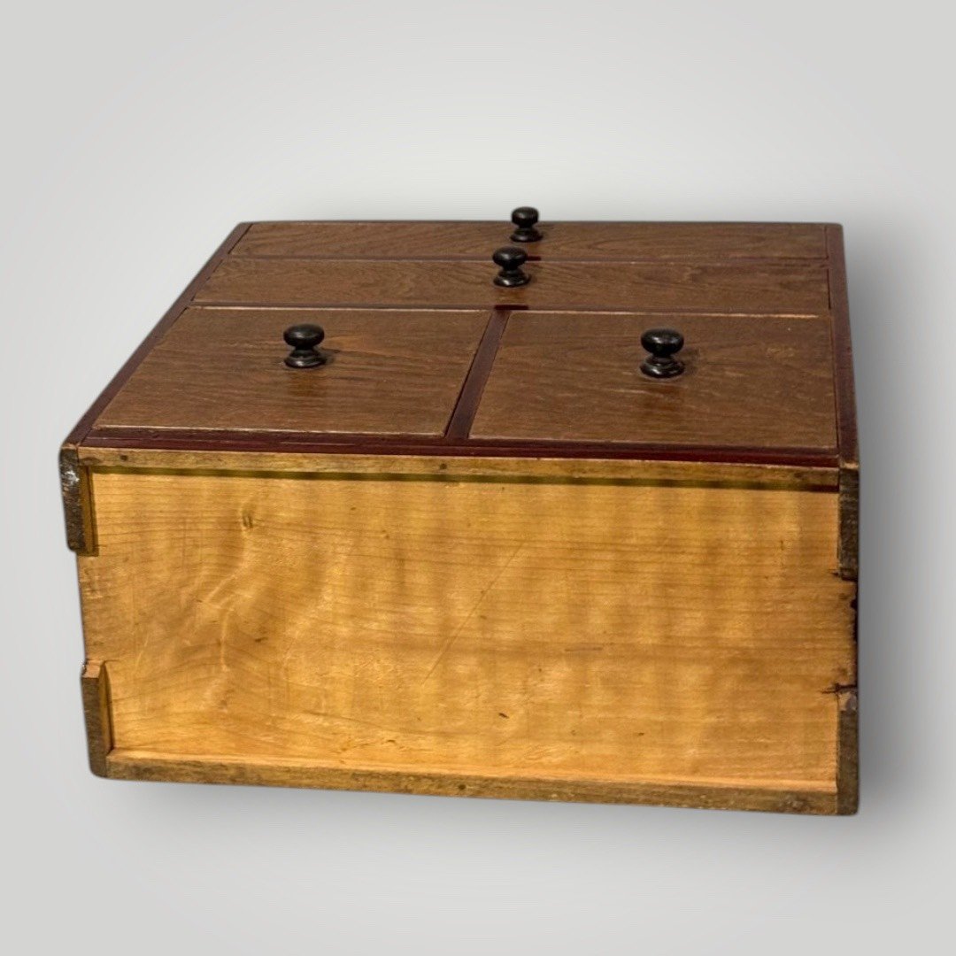 小櫃設計極具巧思,上方兩層為長型寬抽屜,適合放置文具、文件或長型首飾;底層則拆分為兩個方形小抽屜,適合分類收納印章、茶針、或小型的紀念珍玩。