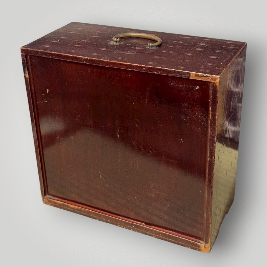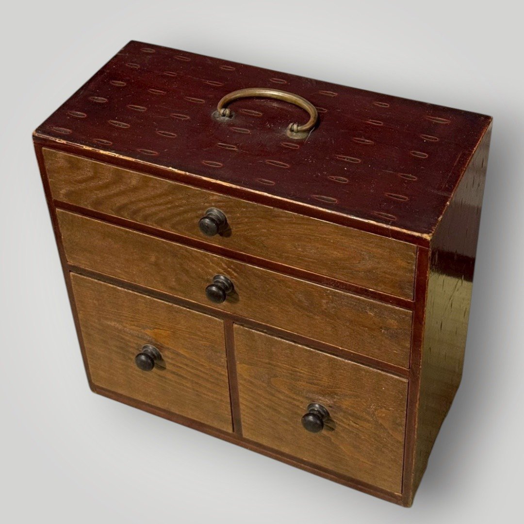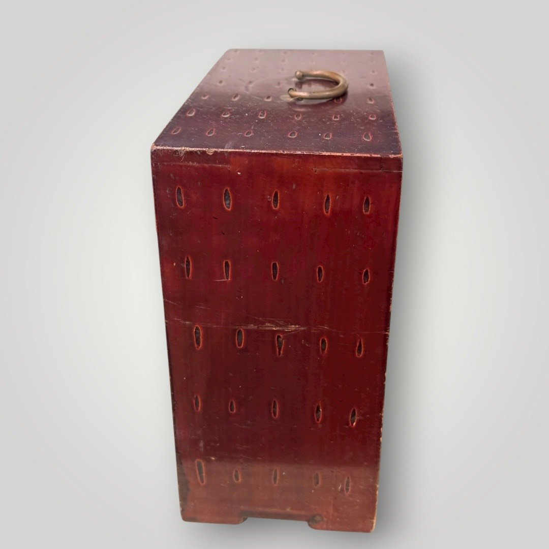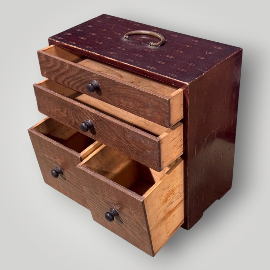 這件小櫃採用了木胎漆製工藝,框架呈現沈穩的深紅褐色漆感,與抽屜面板自然的木紋交相輝映。漆藝不僅能保護木材,更隨著幾十年的使用,氧化出如皮革般溫潤的手感與光澤,這種「老漆味」是仿舊新品無法複製的靈魂。