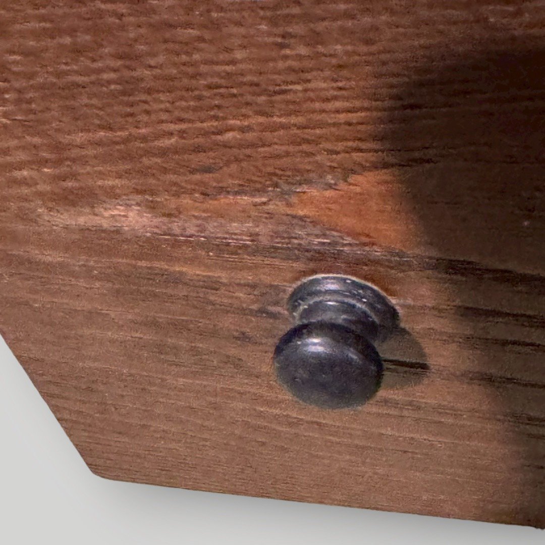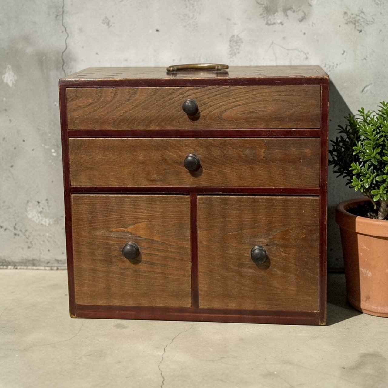 櫃頂配備一只厚實的金屬提把,結構扎實,其「可移動」的設計反映了早期日本居家追求靈活運用空間的生活哲學。抽屜圓鈕手把造型簡潔,展現出昭和時代大眾民藝的質樸美感。