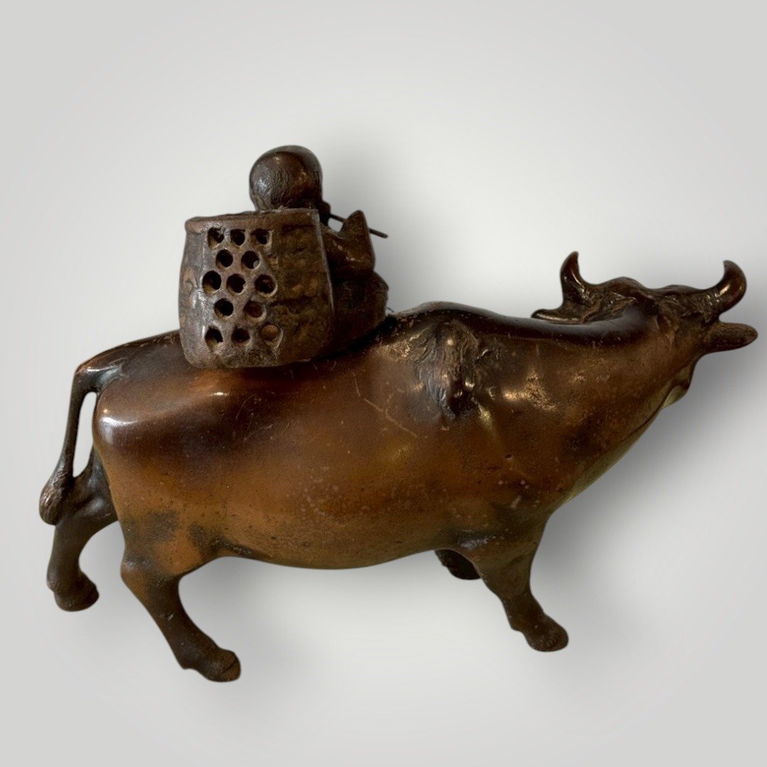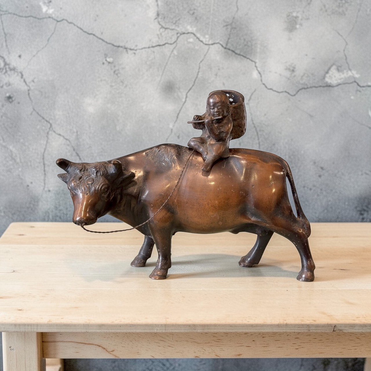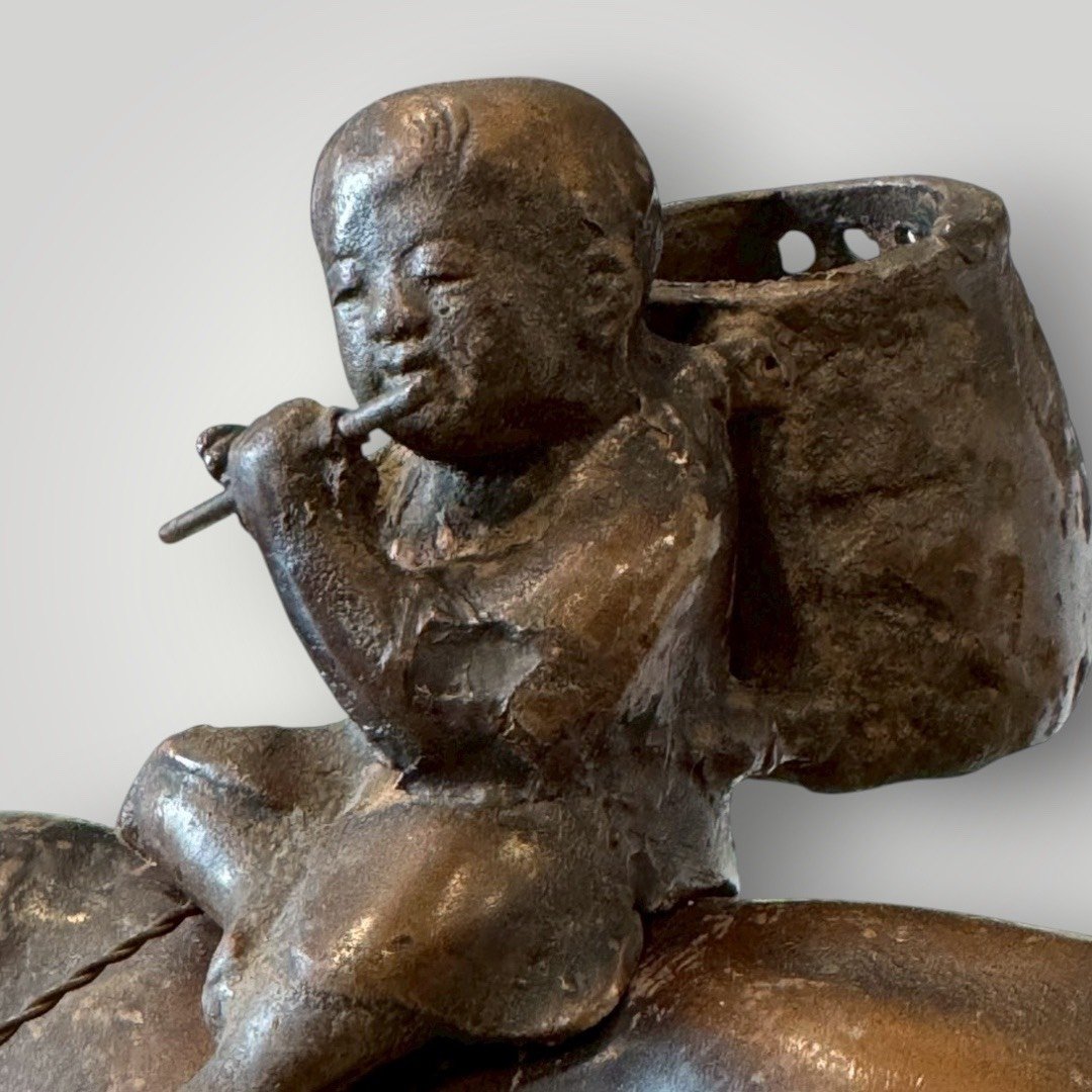 這件作品展現了昭和時期細膩的鑄造技術。牛隻的肌肉線條、厚實的背脊以及微微低頭的姿態,處理得極具生命力;背上的牧童悠然吹笛,神情純樸生動,背後的竹簍細節清晰可見。鑄鐵材質賦予了物件一種如磐石般的穩重感。