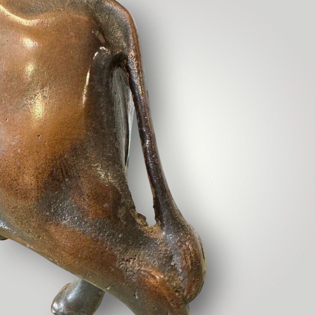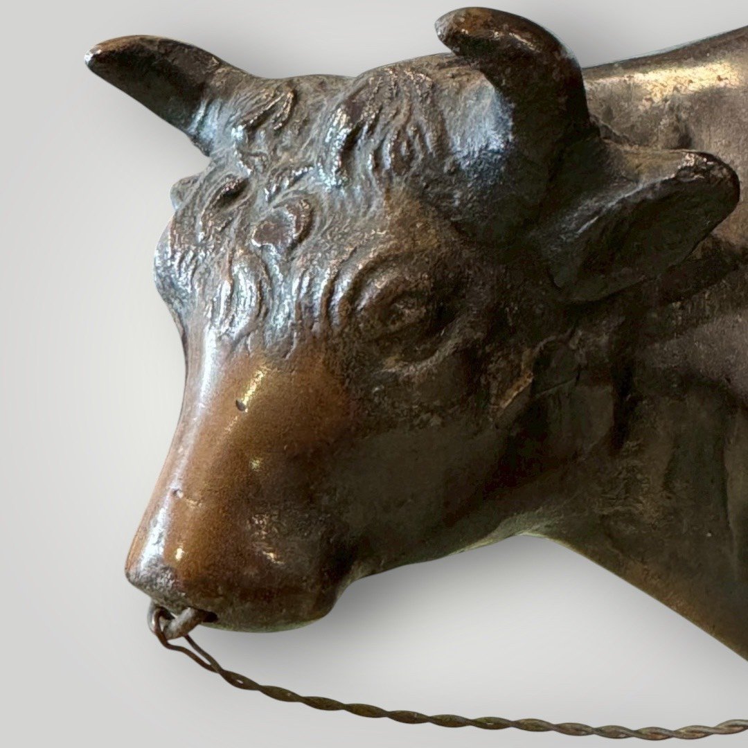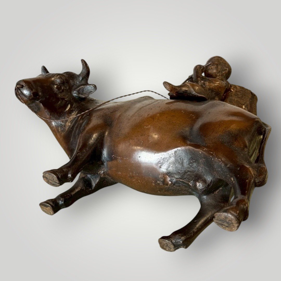 這件作品展現了昭和時期細膩的鑄造技術。牛隻的肌肉線條、厚實的背脊以及微微低頭的姿態,處理得極具生命力;背上的牧童悠然吹笛,神情純樸生動,背後的竹簍細節清晰可見。鑄鐵材質賦予了物件一種如磐石般的穩重感。