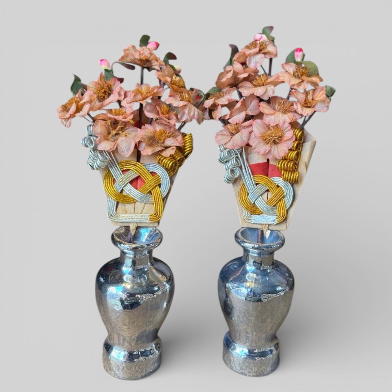 完整的儀式感配備: 組合包含極具辨識度的「高台」,其細長優雅的支柱與寬大的圓形盤面比例完美。中間配有一對銀色錫質小瓶,插有象徵吉祥的紅白紙飾與絹花,完整重現了女兒節祭壇的優雅場景。
