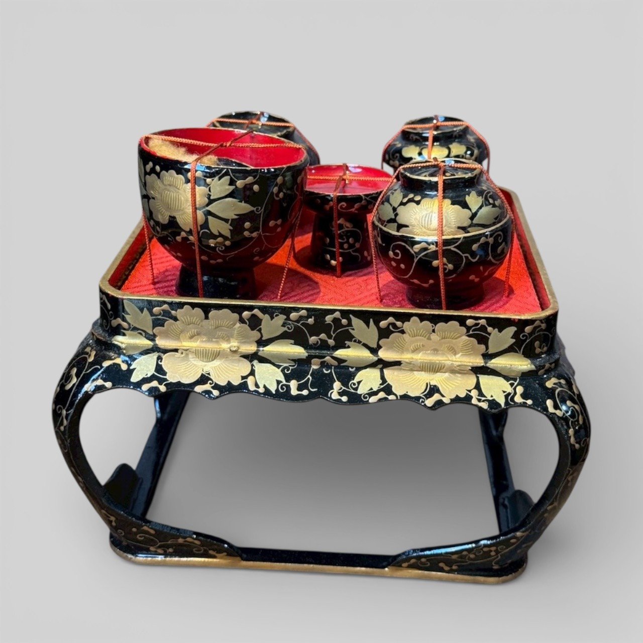 木胎黑漆蒔繪的高級工藝: 不同於後期的塑膠製品,此組採用質地穩定的木胎為底,經多層黑漆塗布後,再由職人手繪金蒔繪。漆黑如墨的底色與華麗的金彩圖騰對比鮮明,呈現出昭和時代嚴謹且奢華的藝術水平。