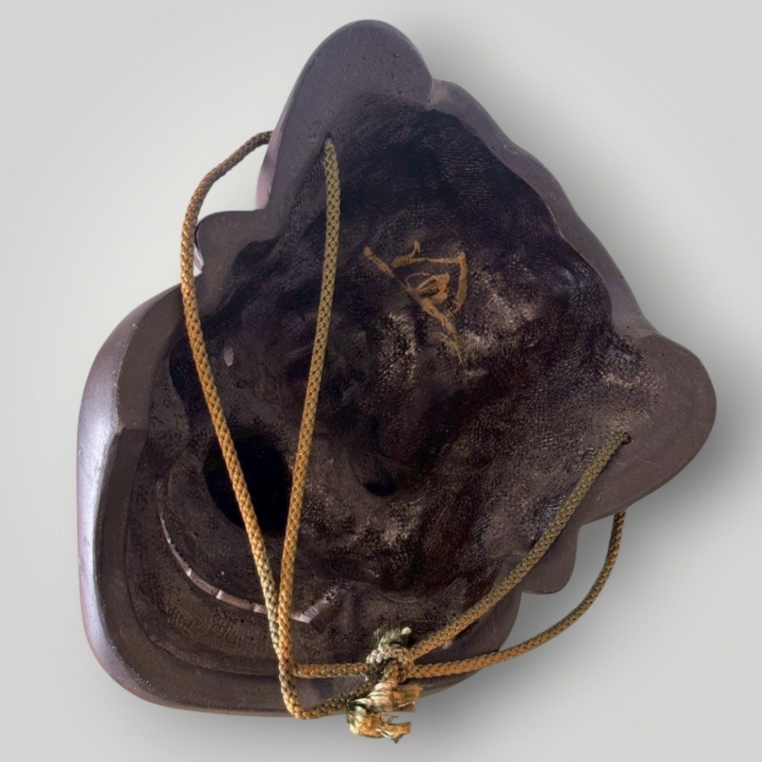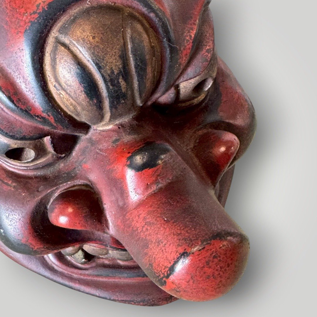 威嚴的木胎雕琢技法: 此件作品採用的木胎工法賦予了面具紮實的重量感與結構。職人精準地捕捉了天狗猙獰且正氣凜然的神態,從隆起的眉骨到深邃的眼窩,線條剛勁有力,將神靈的威嚴感表現得淋漓盡致。