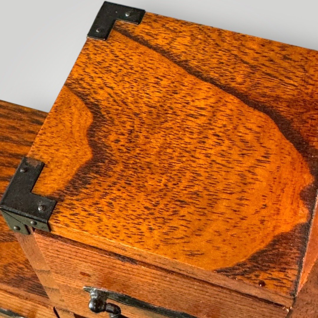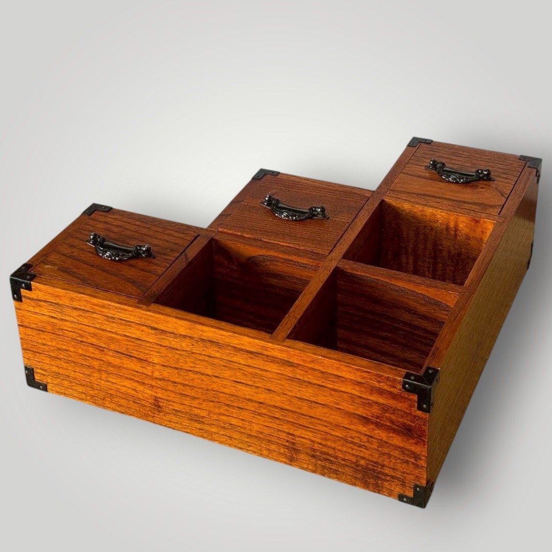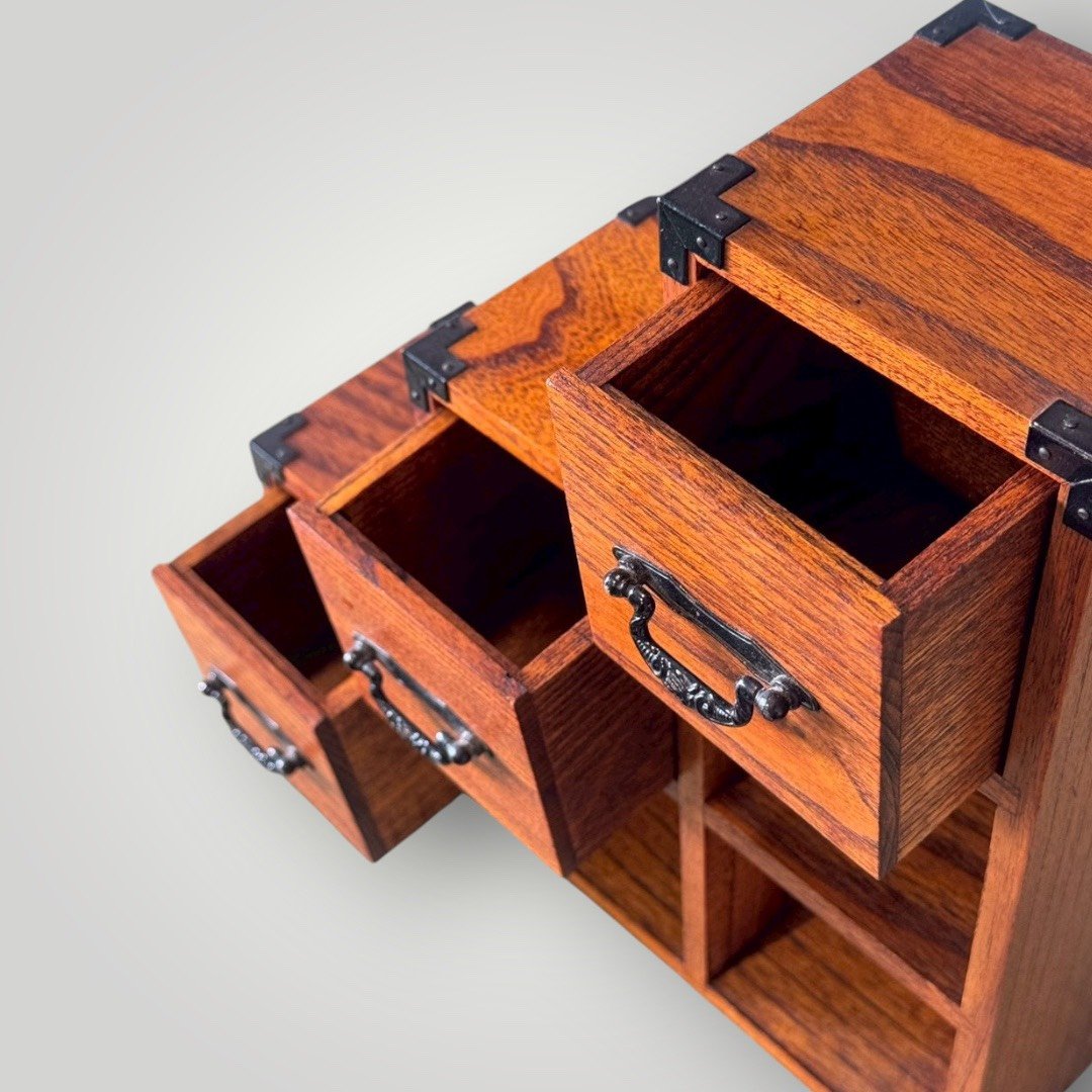虛實結合的展示空間: 櫃體巧妙結合了封閉式抽屜與開放式格位。抽屜可存放印章、珠寶或個人私密小物;開放格位則是展示小型茶盞、古物或微型植物(豆盆栽)的絕佳舞台。這種「藏」與「露」的設計,展現了日式收納的禪意邏輯。