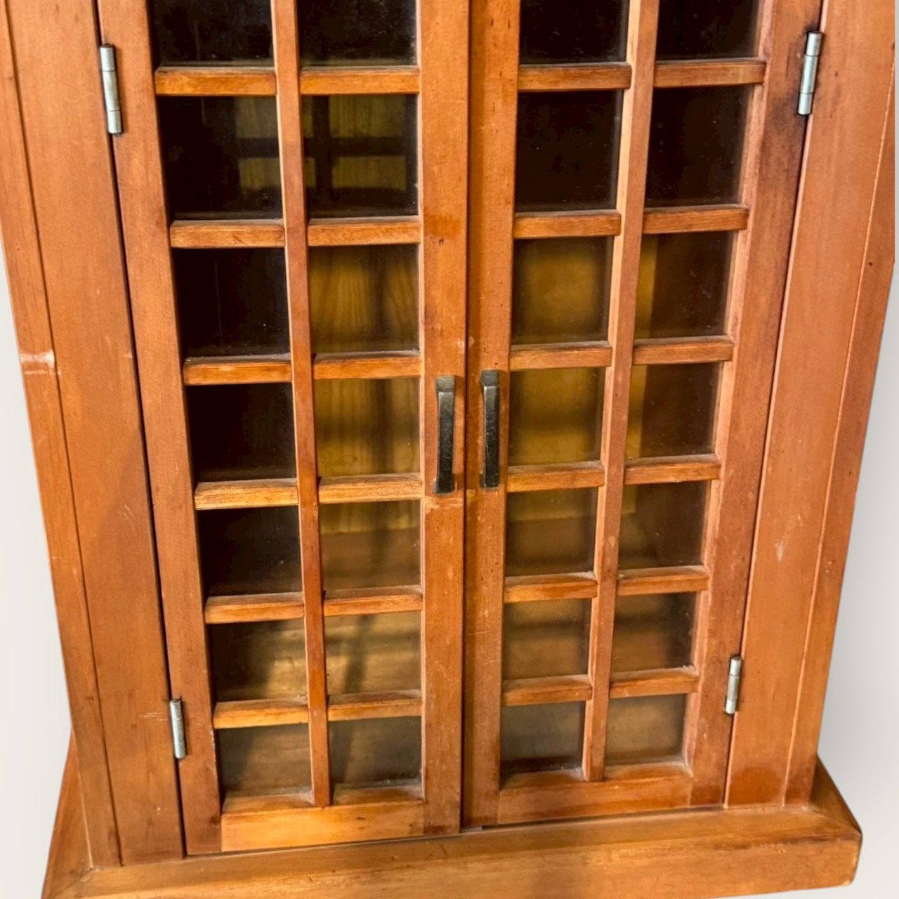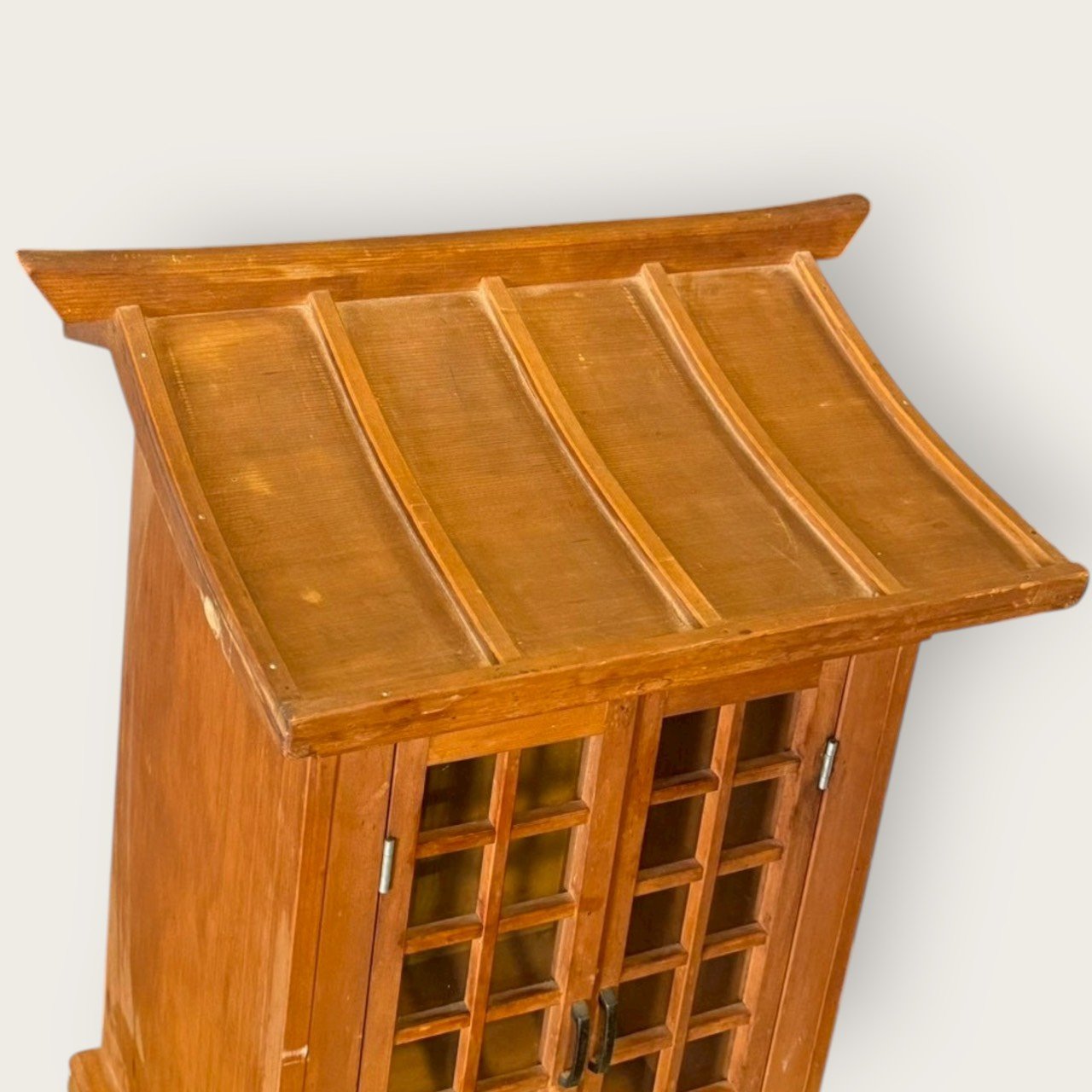 日本家用桌上型佛龕/神龕櫥,以實木製作,外觀採神社屋簷式曲面屋頂格窗雙門設計,造型端正、份量適中,適合擺放在玄關、客廳、和室或書房之端景平台。半透明窗片在燈光下具柔和透光感,可遮掩內部供奉物而保留儀式性氛圍;雙門打開後臺面平整,可安置小尺寸佛像/御守牌位/香爐、供杯、蠟燭台等。