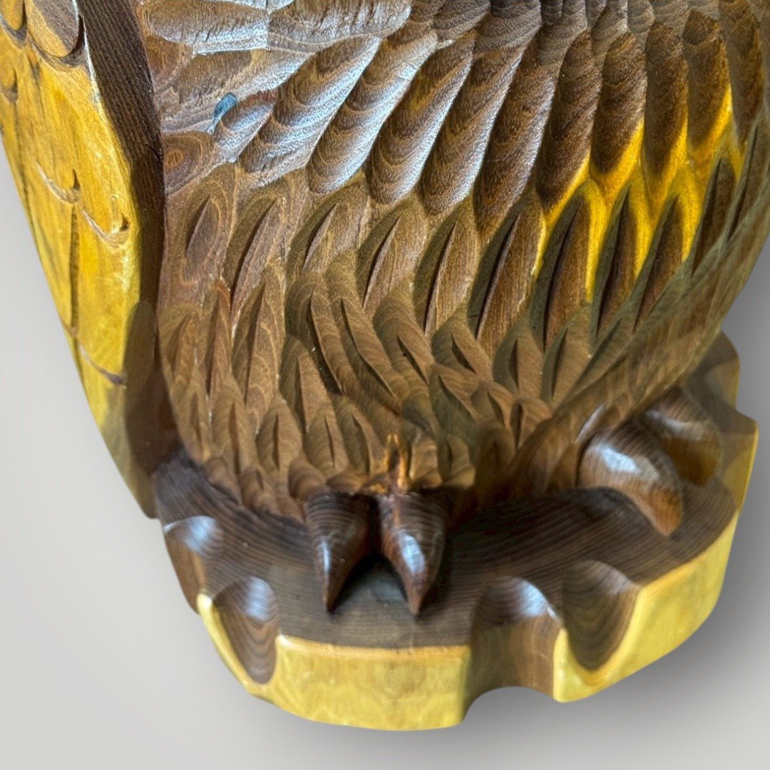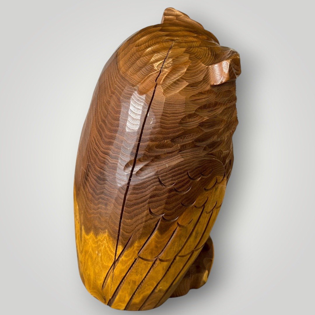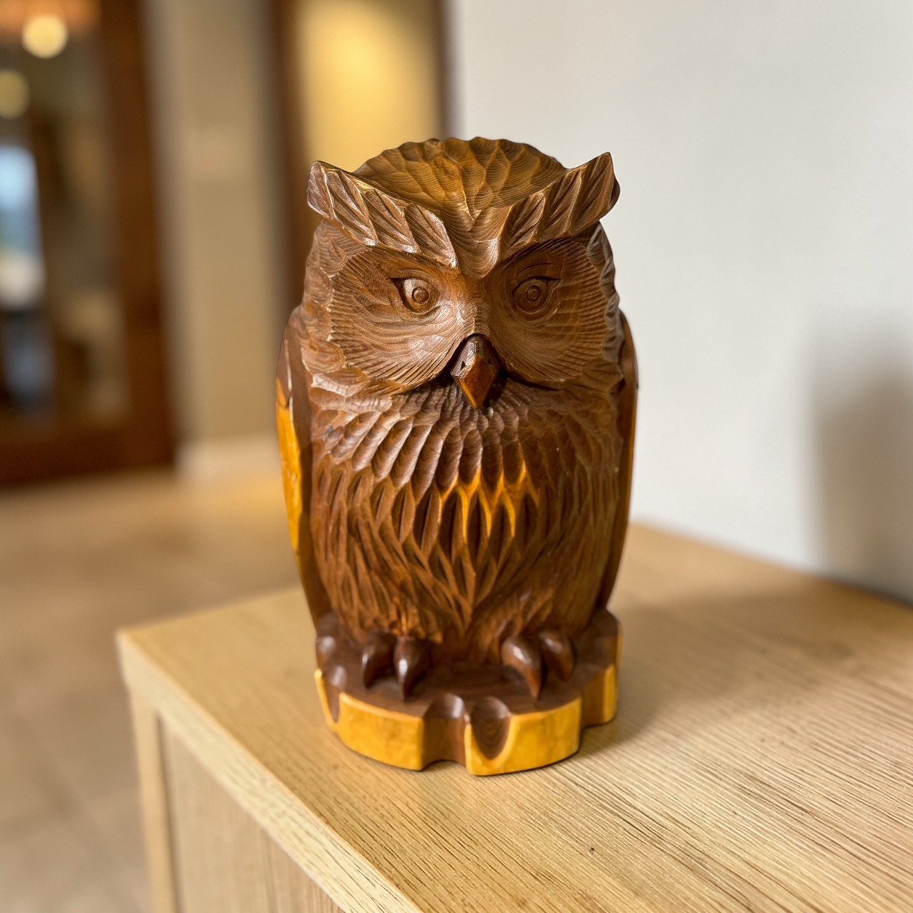 其眼神深邃且帶有英氣,尖銳的喙部與厚實的爪部刻劃有力,生動地捕捉了森林守護者警覺而安穩的神韻。木材本身的深褐色澤隨著歲月沉澱,呈現出溫潤的包漿美感,讓整體造型在威嚴中帶有一絲和諧的溫暖。