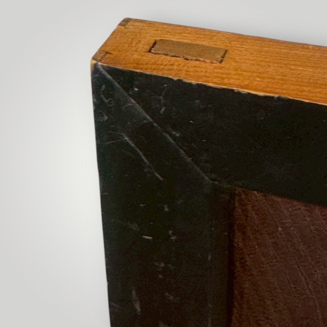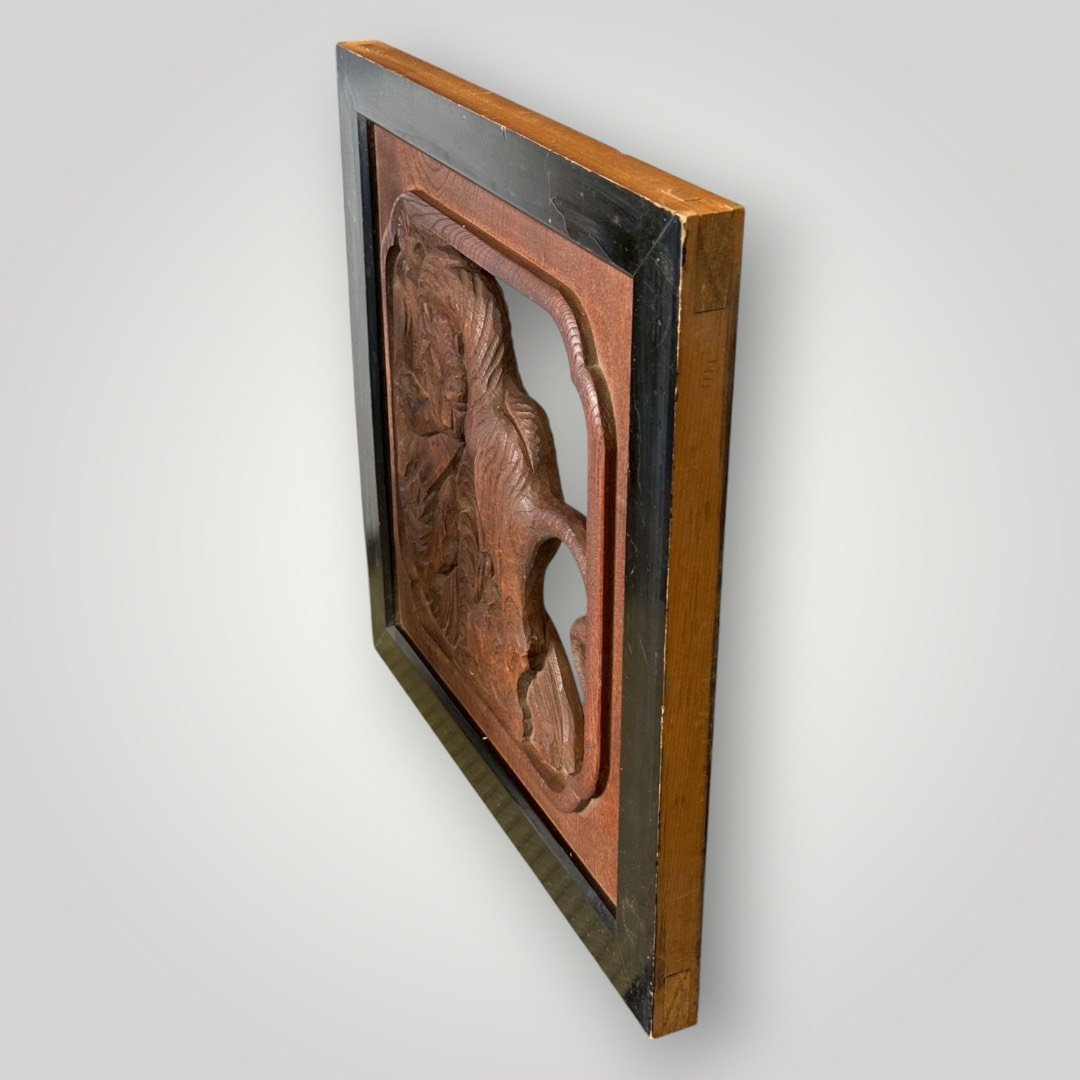 原裝黑漆邊框的對比美: 黑色外框穩定且大氣,與內部溫潤的木雕形成強烈的視覺對比,將觀者的視線鎖定在中央精美的透工藝術上。邊框上的微小歷史痕跡,恰恰證明了其曾作為空間一部分的生命歷程,是老件愛好者最迷戀的「侘寂」證據。