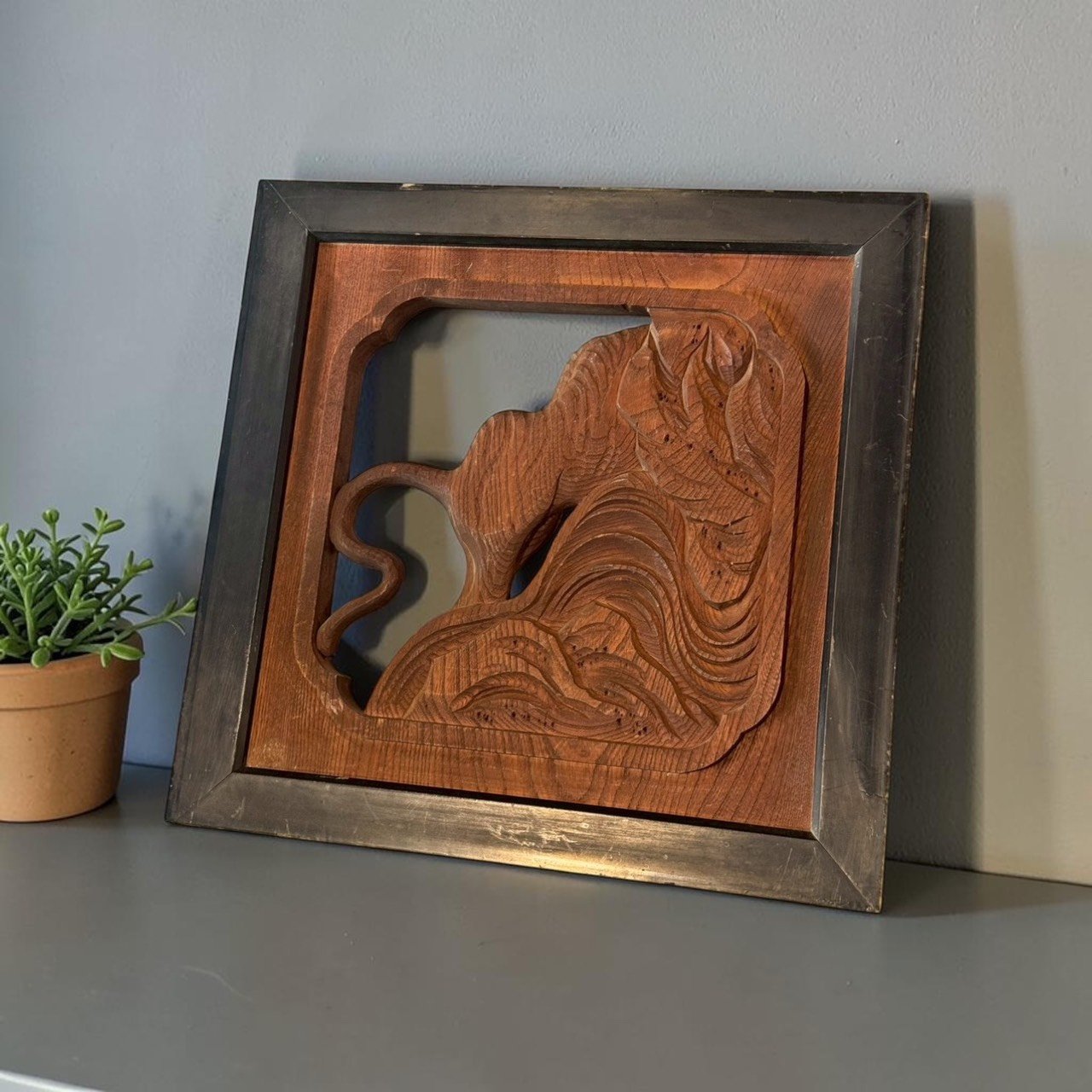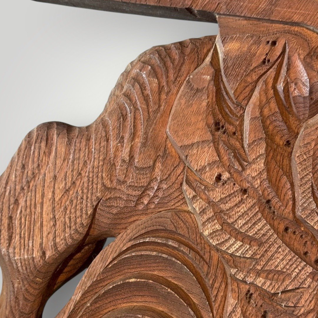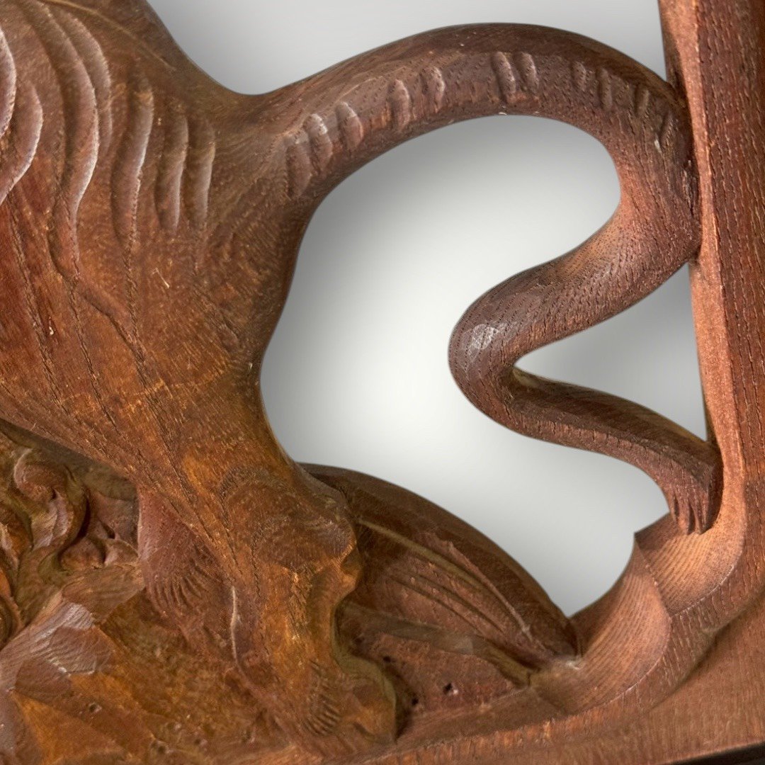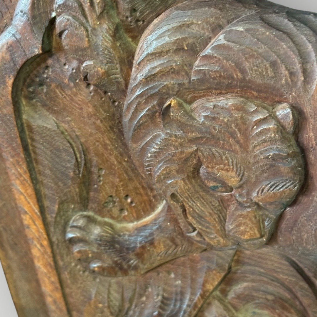 力與美的歷史圖騰: 老虎在日本古美術中象徵「威嚴」與「驅邪」。職人透過粗獷與細膩交織的刀法,展現出老虎皮毛的厚實質感。原木經過長年氧化,呈現出深邃沉穩的琥珀色澤,這種「熟化」的質感是現代仿品無法企及的。
