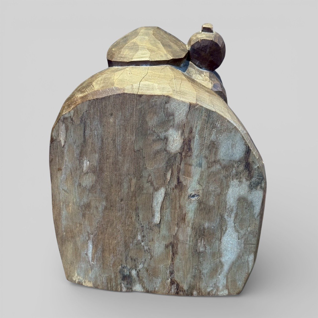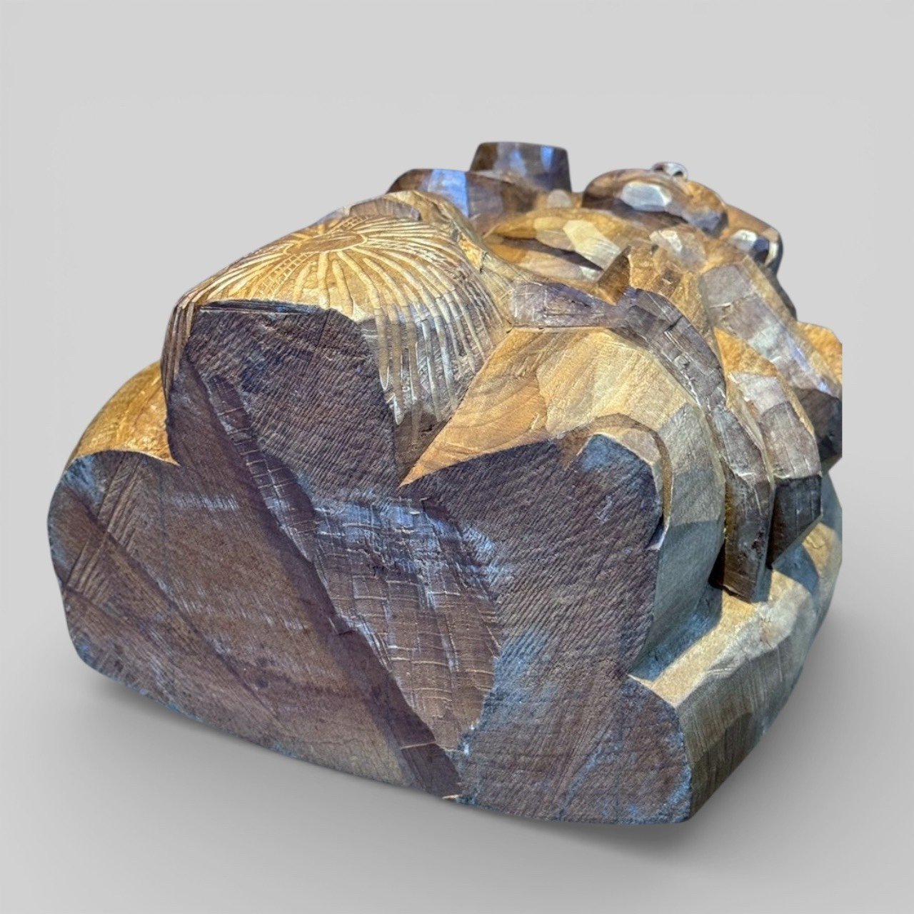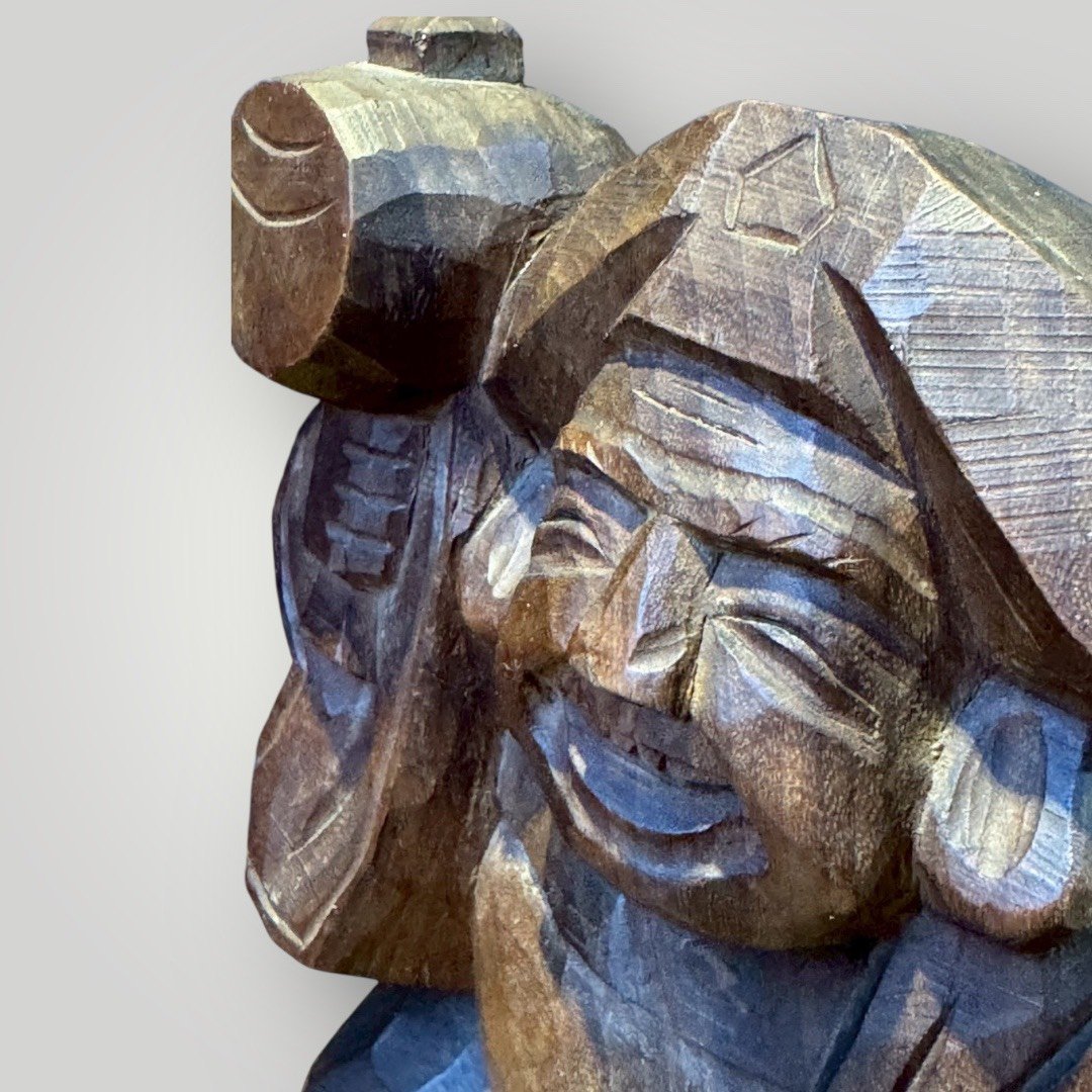 1. 充滿張力的「一刀雕」精神: 此造像最引人注目的是其粗獷中帶細膩的刀法。職人利用俐落的切面(Facet)勾勒出大黑天的豐滿體態與衣褶,這種表現手法讓木雕在不同光線角度下能呈現豐富的立體感與陰影變幻。大黑天面帶慈祥燦爛的笑容,神情刻畫得栩栩如生,讓人望之便能感受到喜悅與安定的能量。