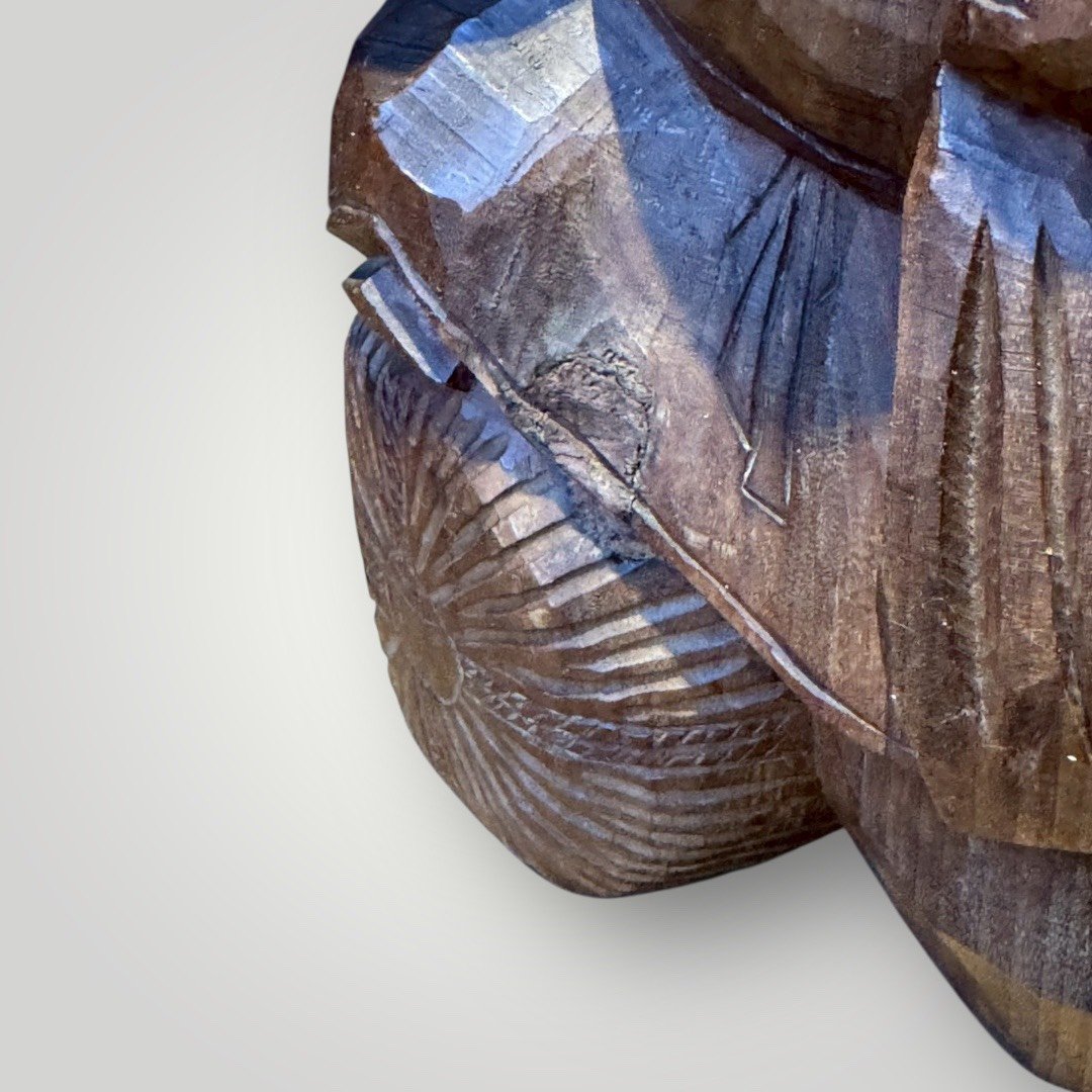 3. 天然原木的溫潤質感: 採用質地堅實的原木雕刻,表面保留了天然的褐色調與細膩的木肌紋理。木頭會隨著時間與空氣產生「熟化」,色澤會愈發深邃亮麗。相較於金屬或陶瓷,木製造像更具備一種溫暖的親和力,能與各種家居風格完美融合。