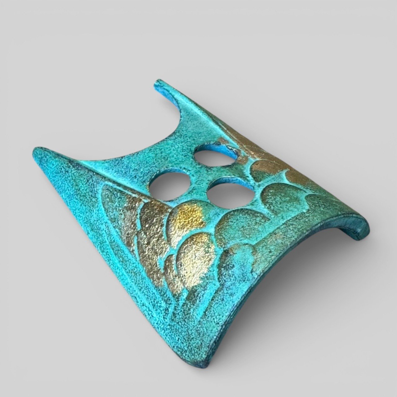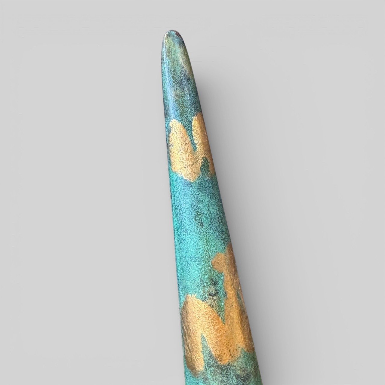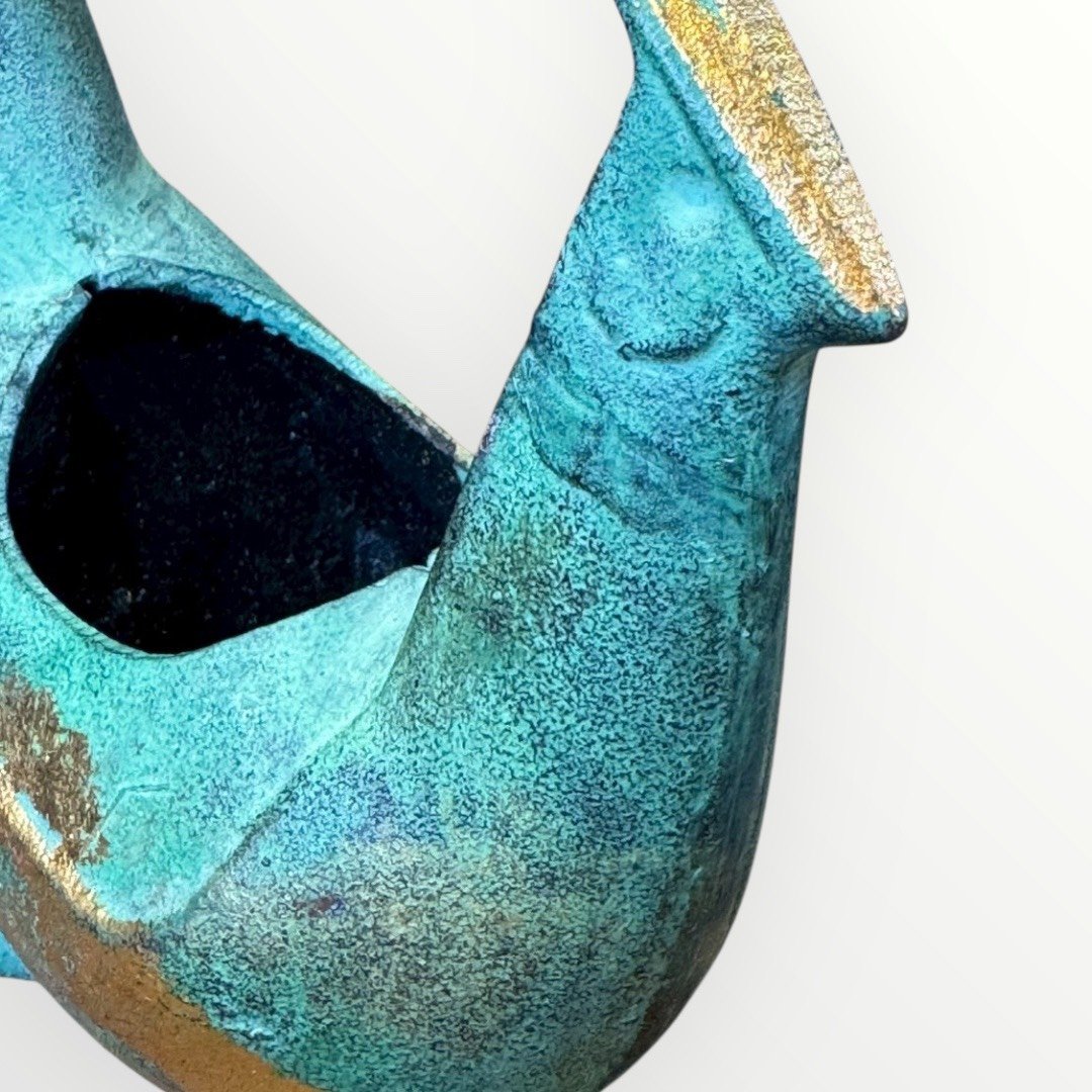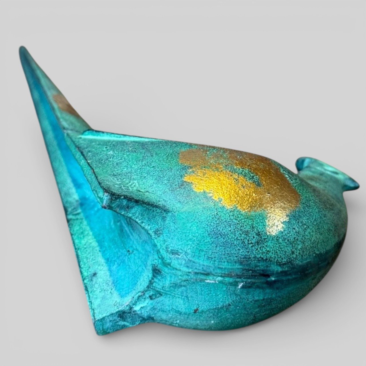 層次豐富的「青銅綠」與「金彩」: 鐵胎表面採用了考究的舊化處理,呈現出深邃的青銅綠氧化感。職人更在羽翼、胸口與尾翼處點綴了斑駁的**「手繪金彩」**,金色與綠色在光影下交織出奢華而神祕的質感,彷彿歷史塵封中重新煥發光芒的珍寶。