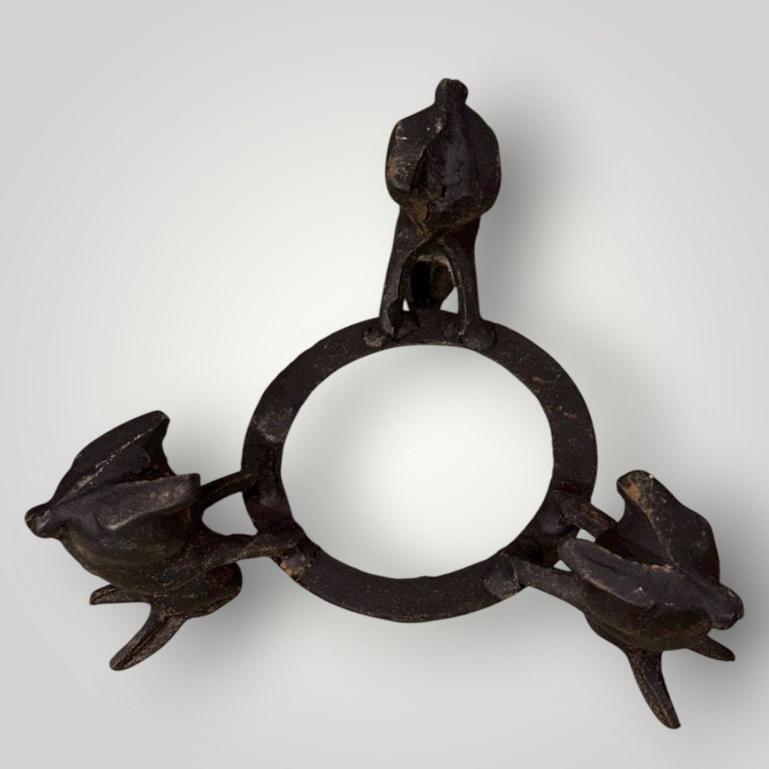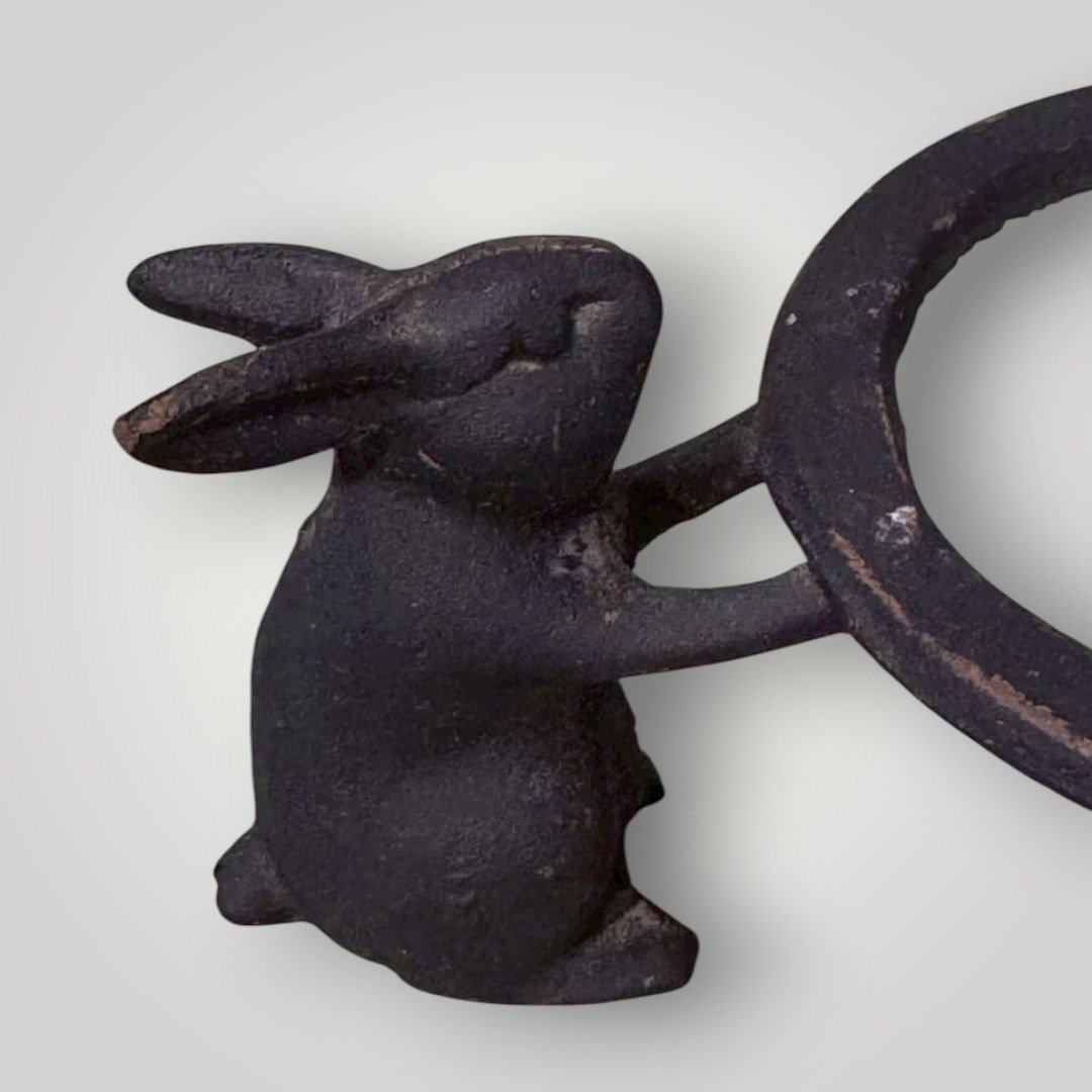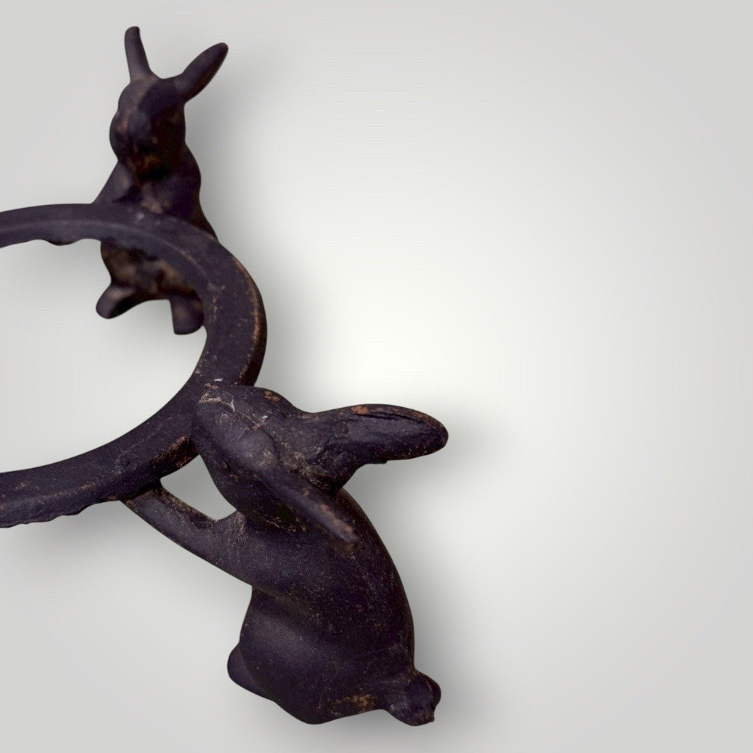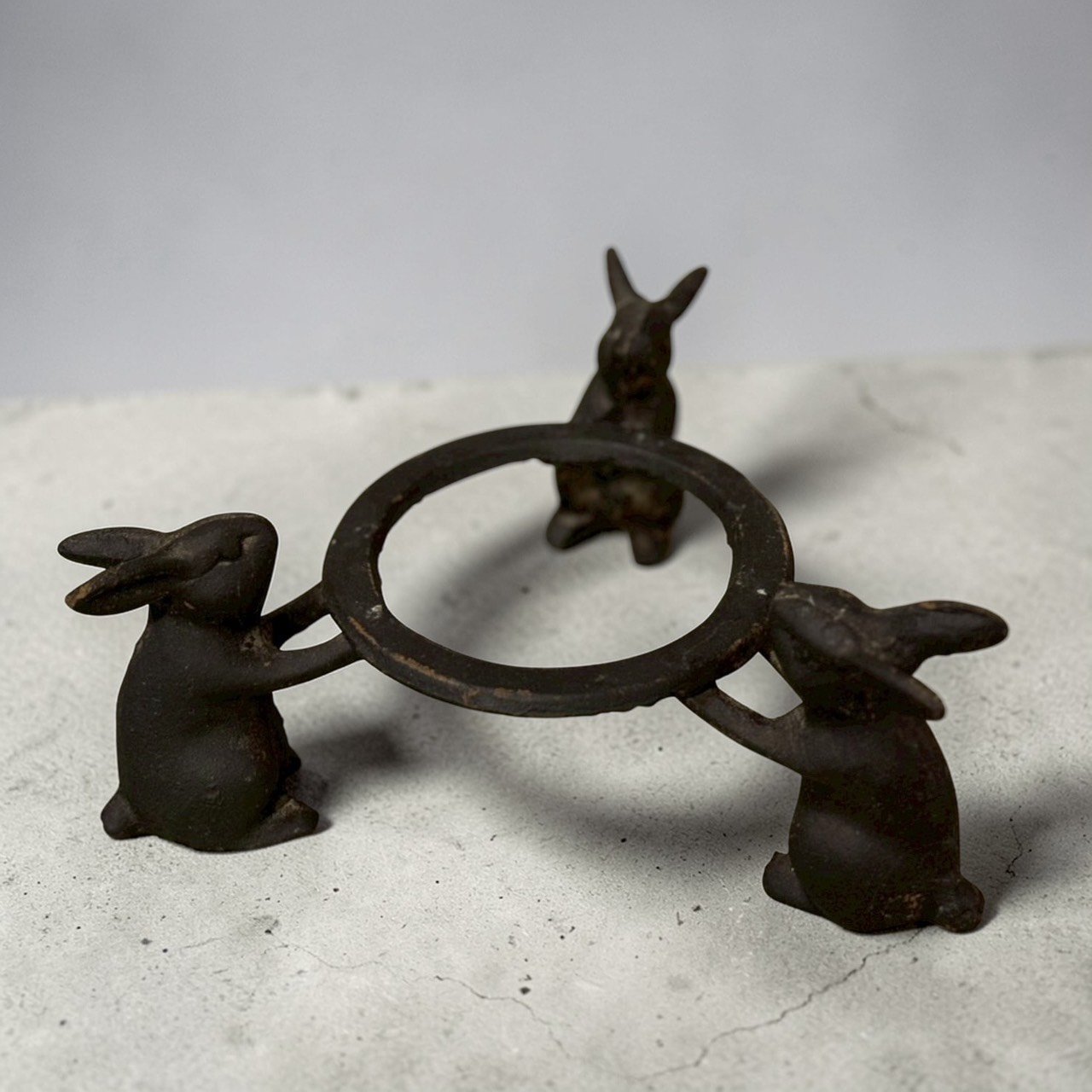 這件作品最迷人之處在於支架的設計,由三隻姿態各異的兔子合力托舉起圓環。兔子在日本文化中象徵「飛躍、多子多孫、長壽」以及「月亮的神使」,其長耳與靈動的身形被細膩地刻畫在厚實的鑄鐵中,將原本剛硬的鐵器賦予了柔和的敘事感。