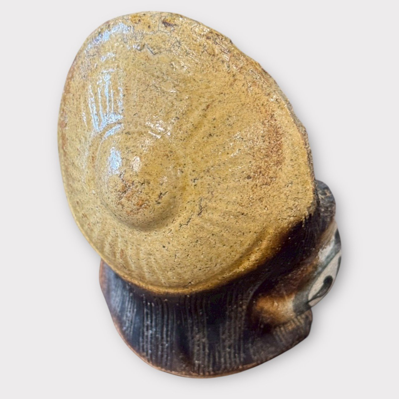帽沿與身體釉色層次豐富,從深到淺的過渡帶有自然「窯變」效果,每一尊色澤分布都不盡相同,屬於獨一無二的老陶魅力。 -