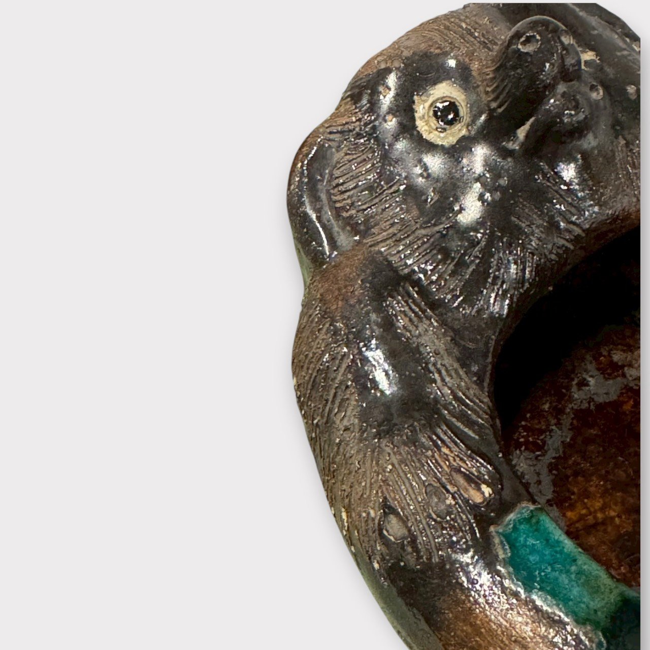 自然釉流瀑布感:綠松石釉自沿口流入槽內,厚薄層次明顯、光澤迷人。