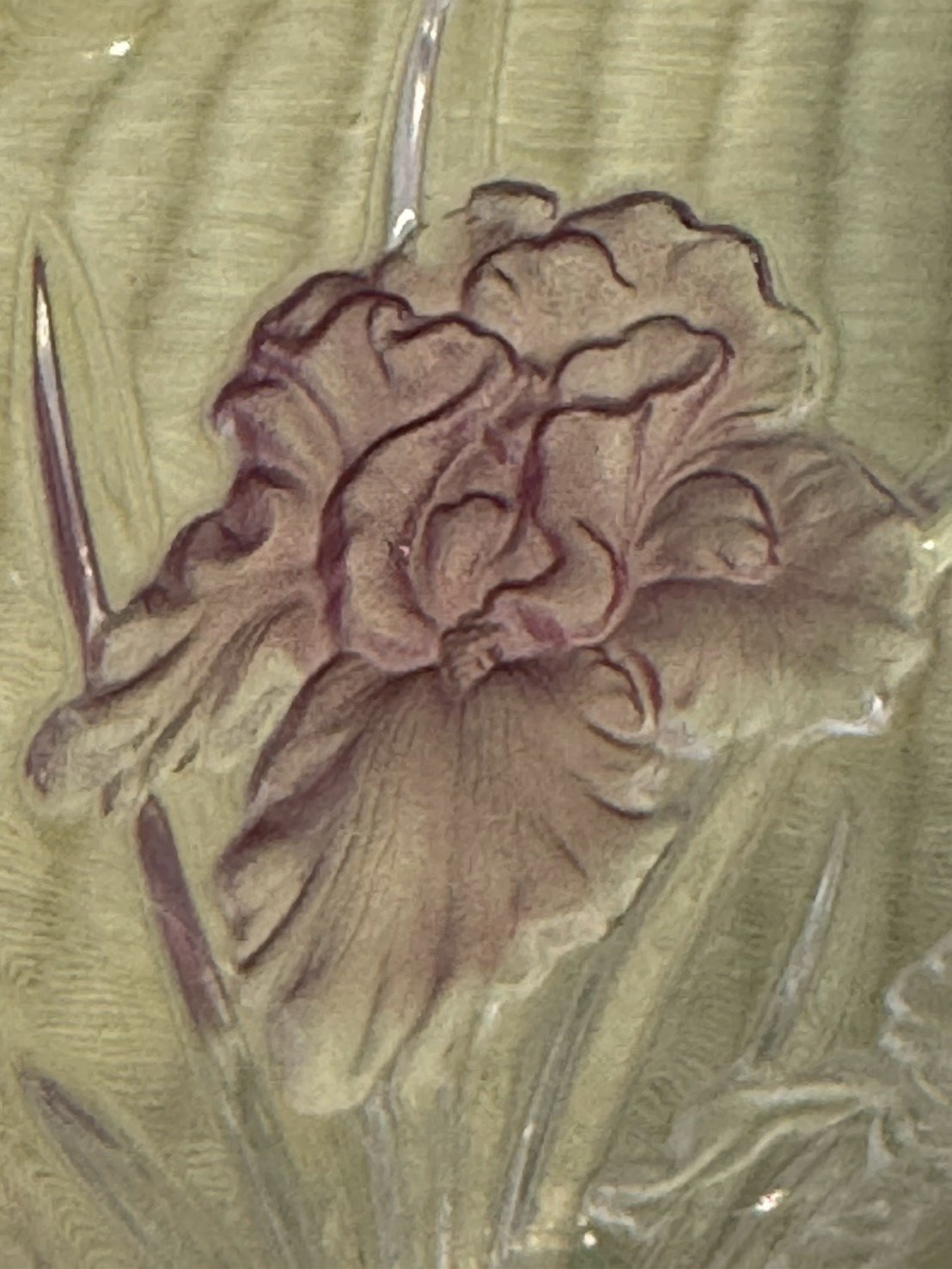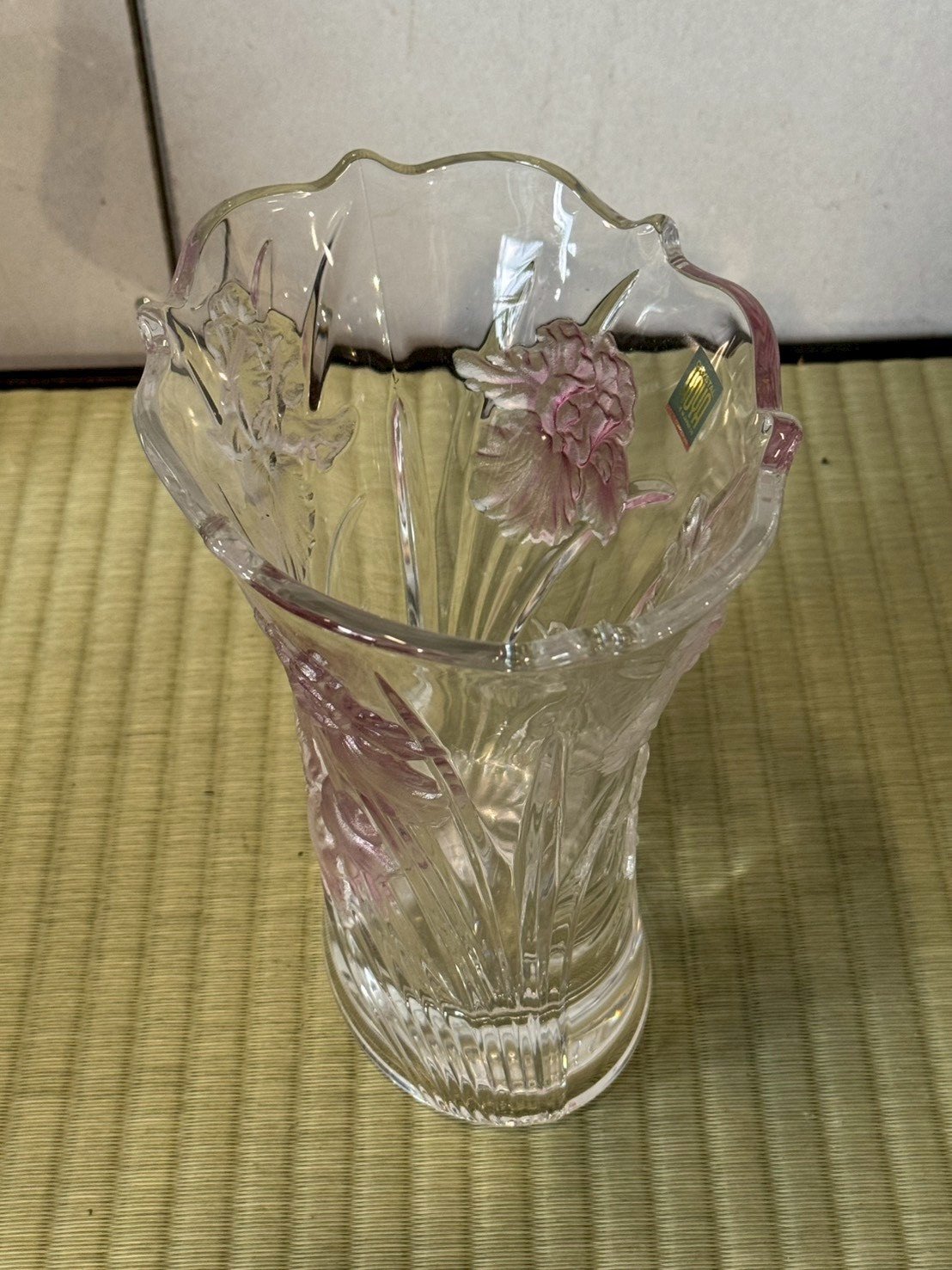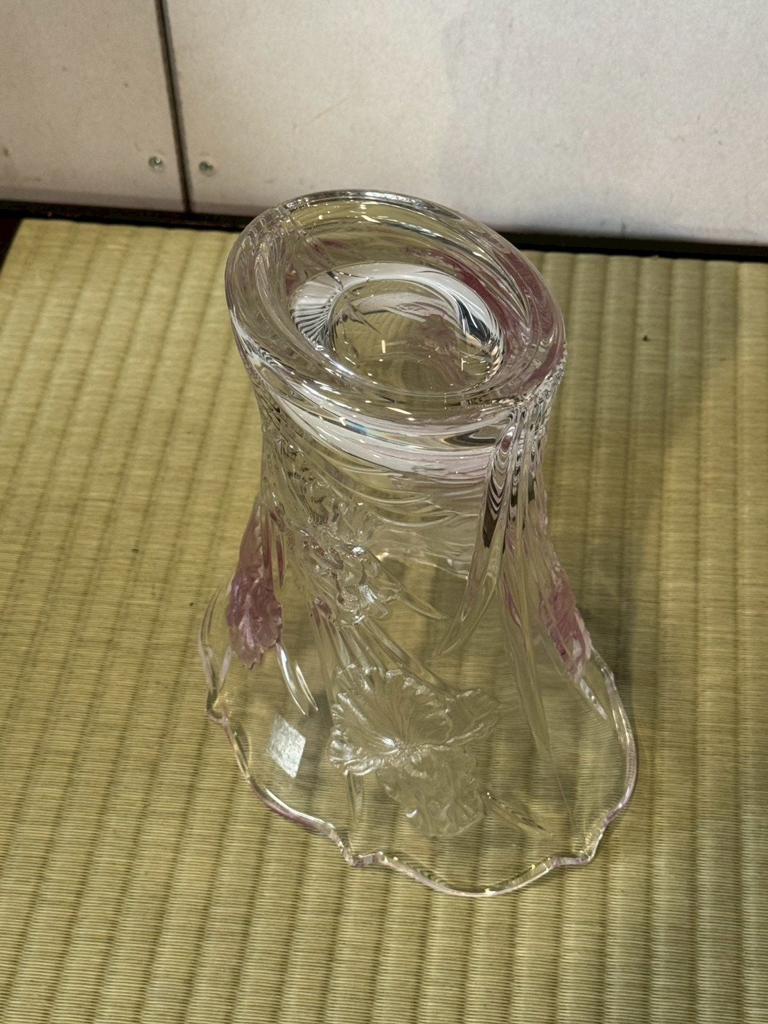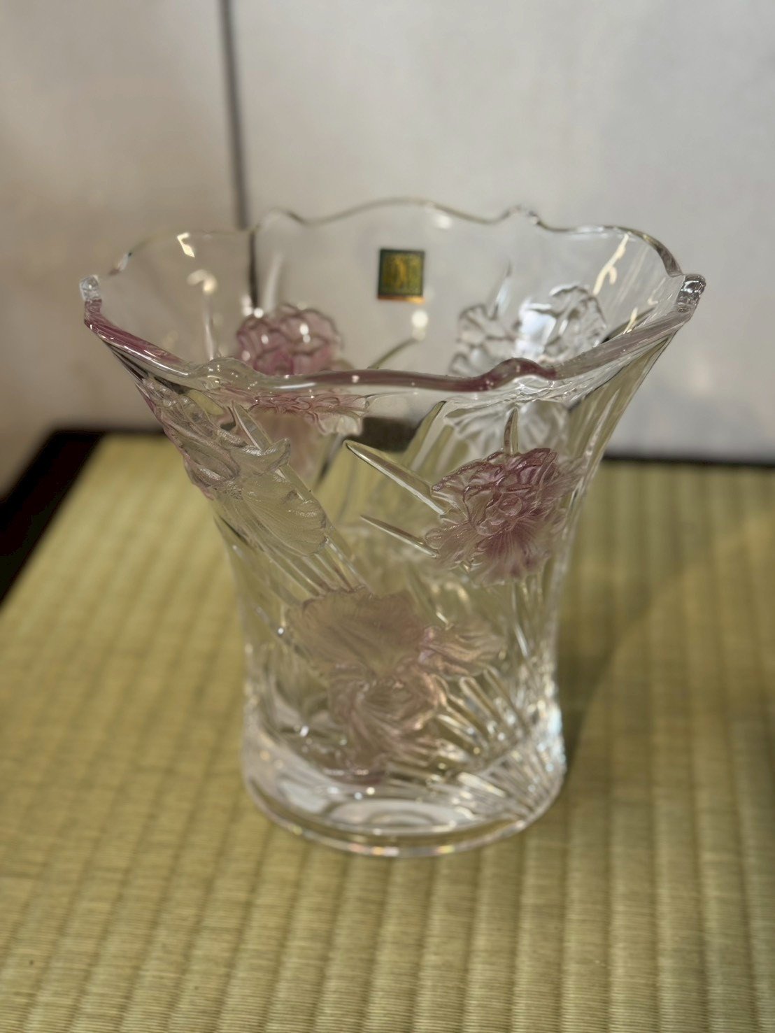 細膩的立體浮雕與粉色磨砂設計: 花器外壁以高難度的立體浮雕(Relief)刻畫出多朵盛放的花卉,花瓣紋理栩栩如生。最令人驚豔的是職人採用了局部噴砂粉色暈染,讓半透明的粉色如同柔焦般散佈在花芯與花瓣邊緣,營造出一種如夢似幻、溫柔雋永的昭和懷舊氛圍。
