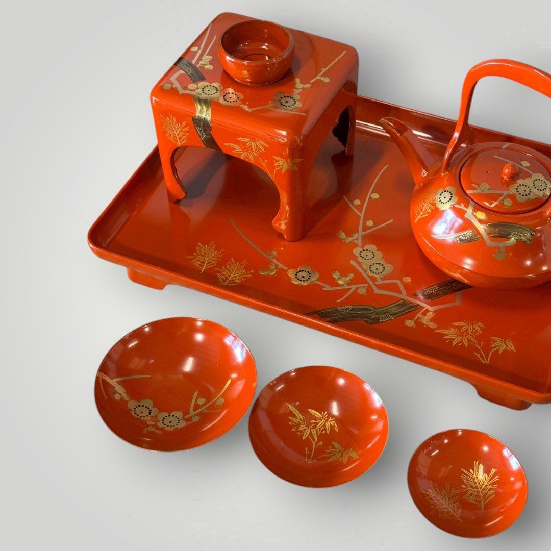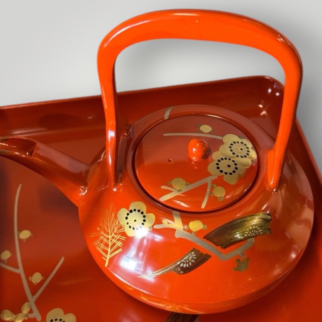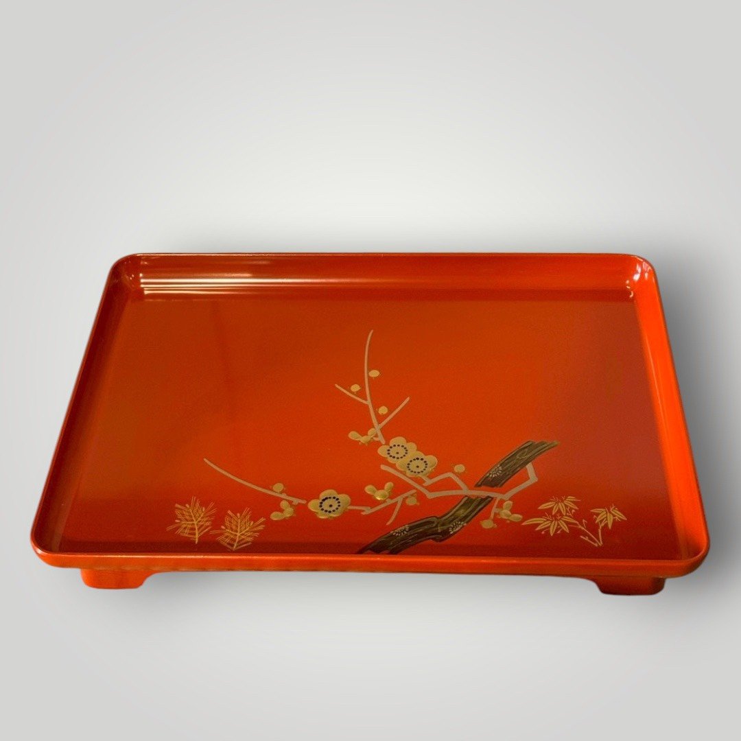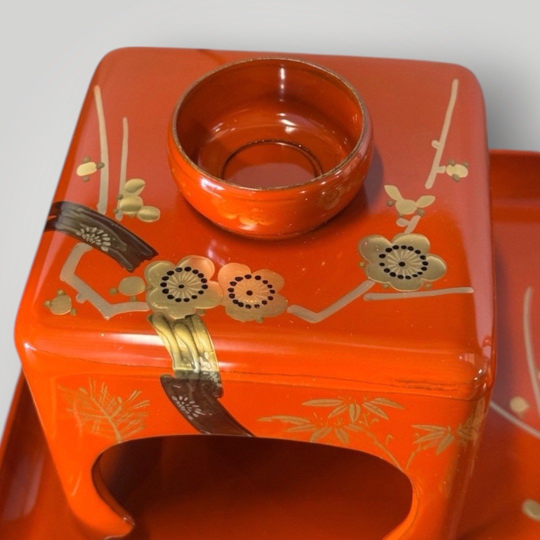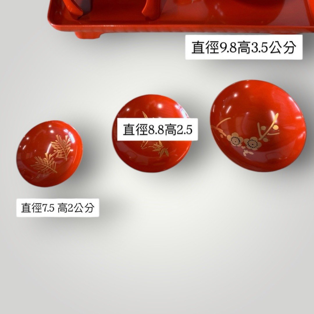 吉祥頂點:松竹梅金蒔繪工藝 器身與底托均描繪了精美的「松、竹、梅」金蒔繪。松象徵長壽、竹代表韌性、梅則寓意先驅與高潔。職人運用金粉在朱紅色的漆面上勾勒,色彩鮮豔奪目而不失莊重,完美詮釋了日本「祝事(慶典)」的美學巔峰。