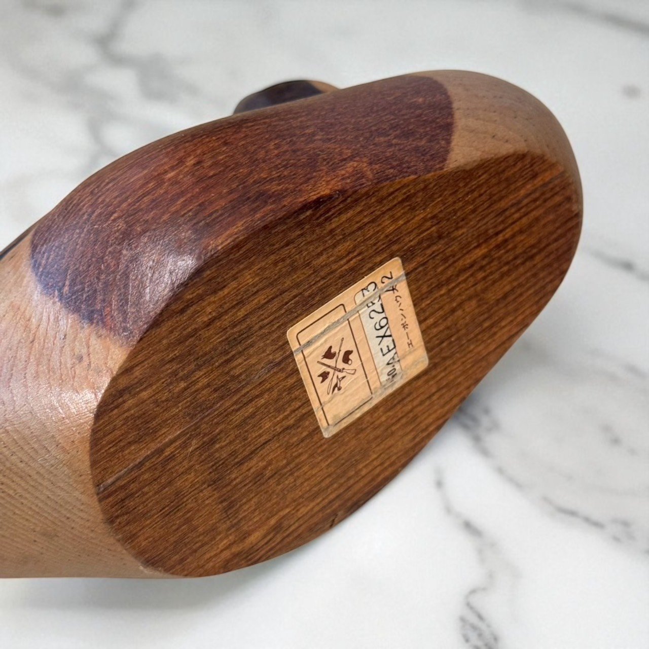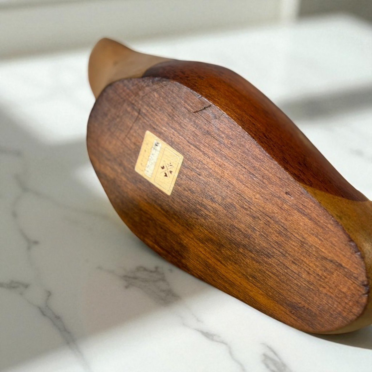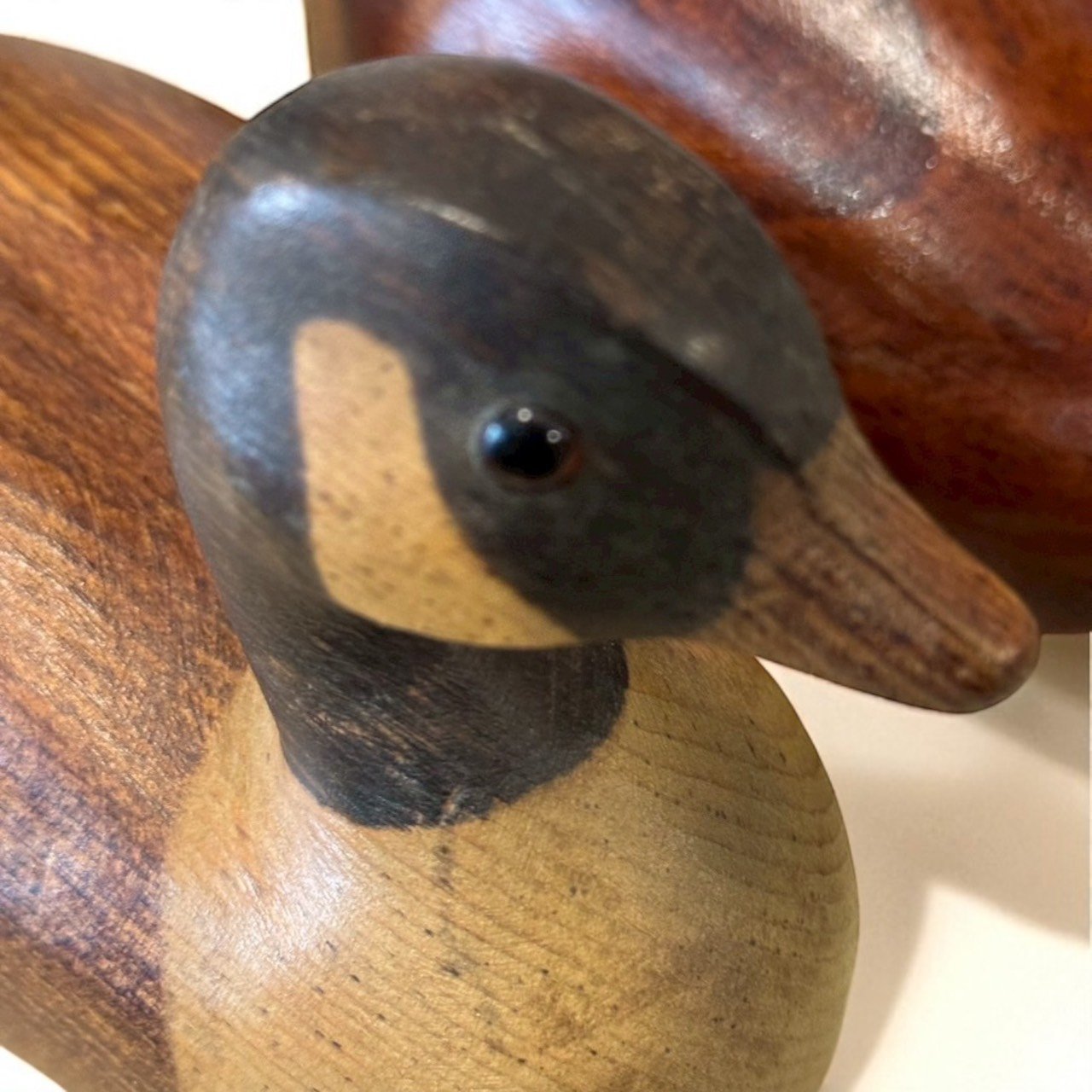 眼神有神、鴨喙比例自然,羽毛區塊以不同木色分界,線條平滑過渡無明顯接縫,連底部打磨也平整細緻,是日本工藝注重「看不見的地方也要美」的實例。 -