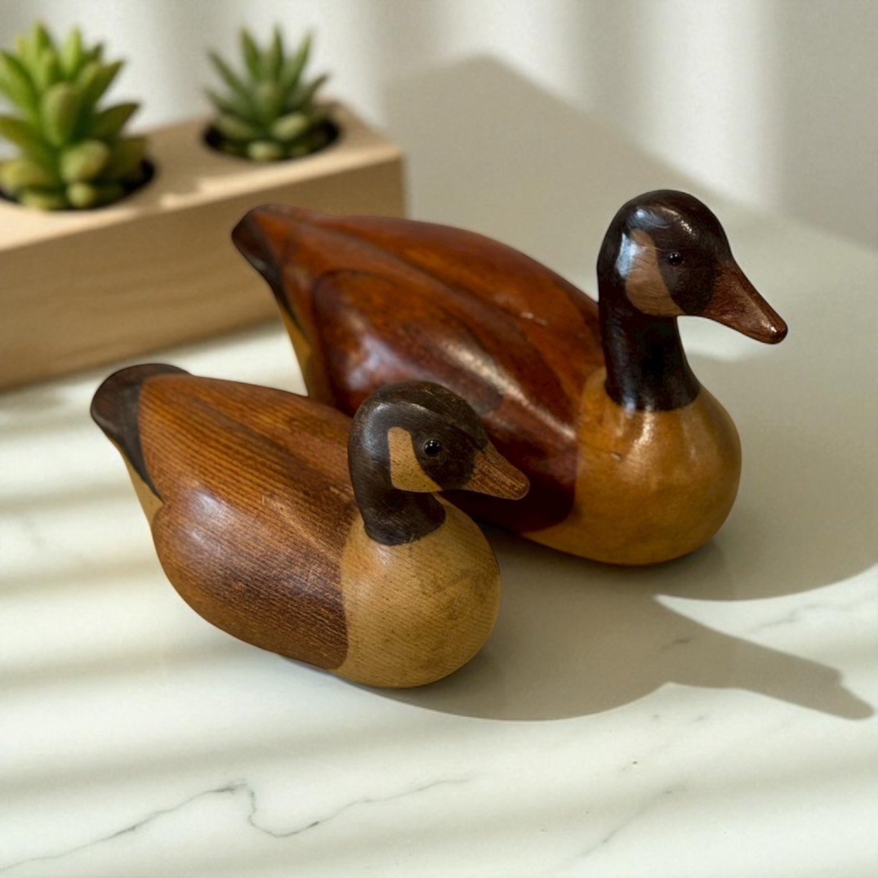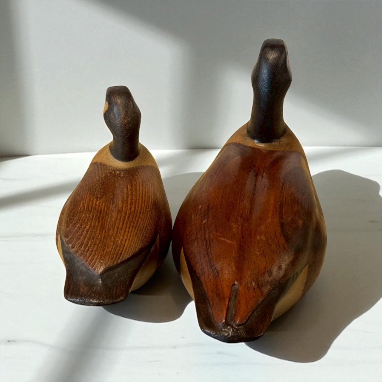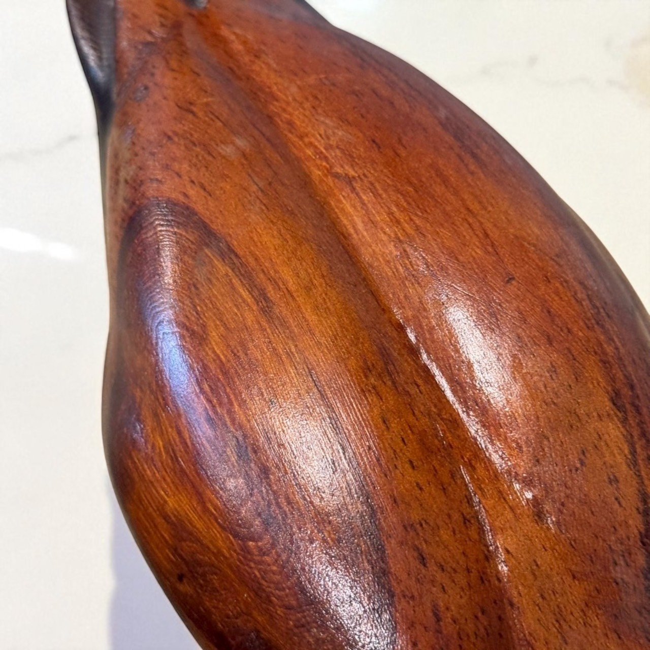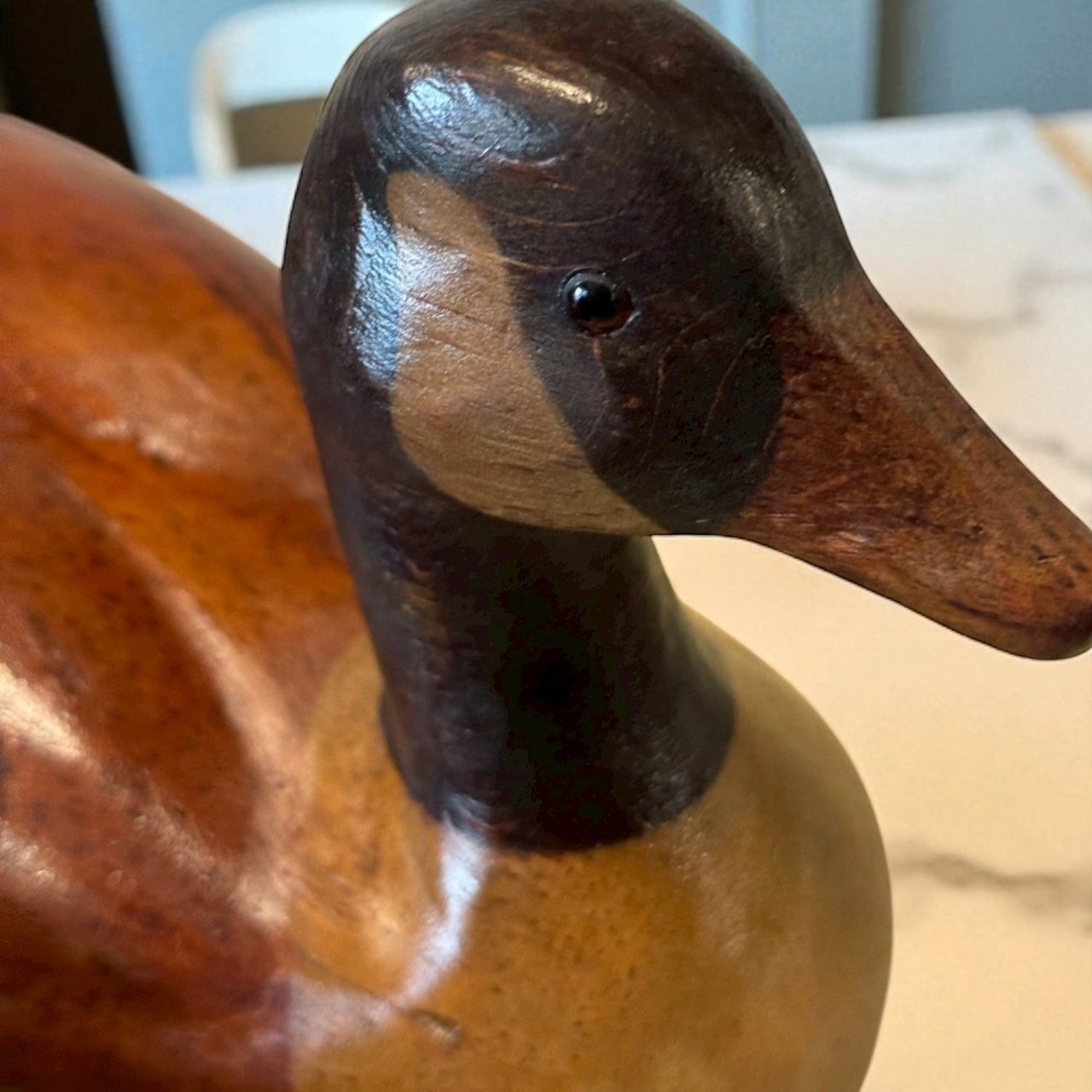 眼神有神、鴨喙比例自然,羽毛區塊以不同木色分界,線條平滑過渡無明顯接縫,連底部打磨也平整細緻,是日本工藝注重「看不見的地方也要美」的實例。 -