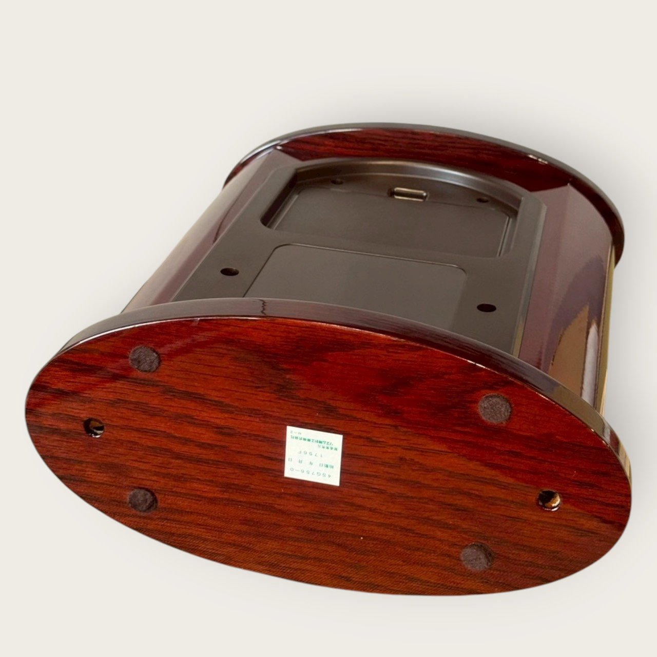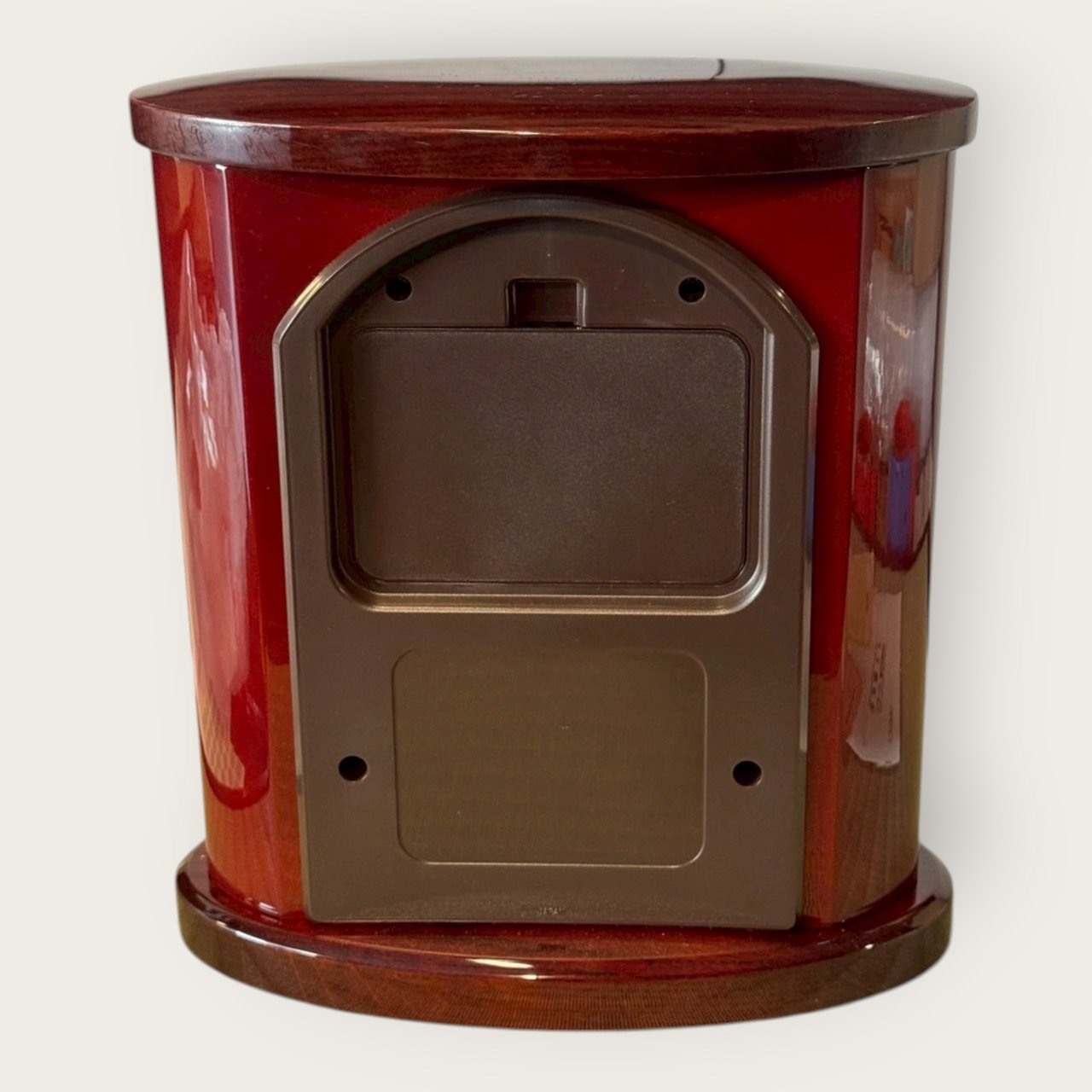 經典木紋亮面外殼:高亮鋼琴烤漆質感,圓弧箱體配金色內框,沉穩而不失華麗。