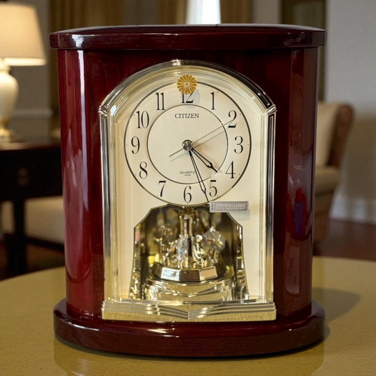 晶鑽旋轉裝飾:面盤下方水晶元素旋轉座,燈下呈現細緻折射,提升陳列觀感。